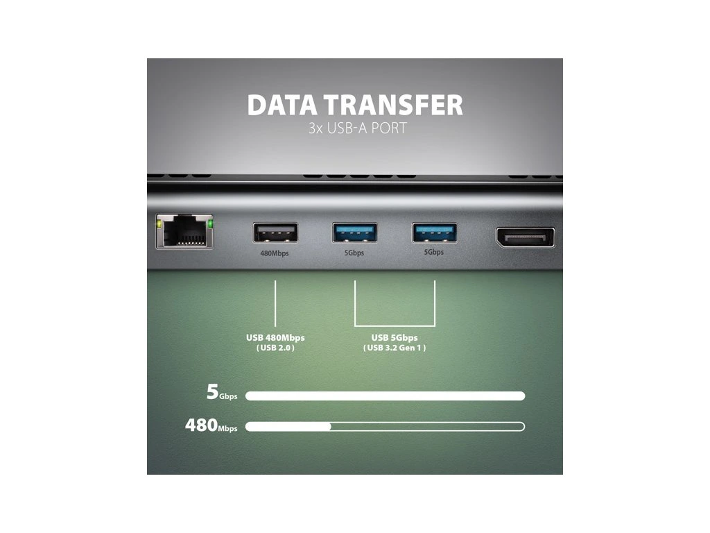 Multiportový USB-C 5Gbps TRIPLE 4K DISPLAY hub AXAGON HMC-4KX3 rozšíří Váš notebook o devět portů a čtečku paměťových karet SD / microSD. Přes oboustranný USB-C konektor snadno a rychle připojíte k počítači až tři monitory, tři USB zařízení, Gigabitovou ethernet síť, sluchátka a čtečku karet současně. Zároveň získáte možnost napájení notebooku pomocí technologie Power Delivery. USB-C hub tak zastane funkci univerzální a výkonné dokovací stanice 11v1 pro moderní notebooky.