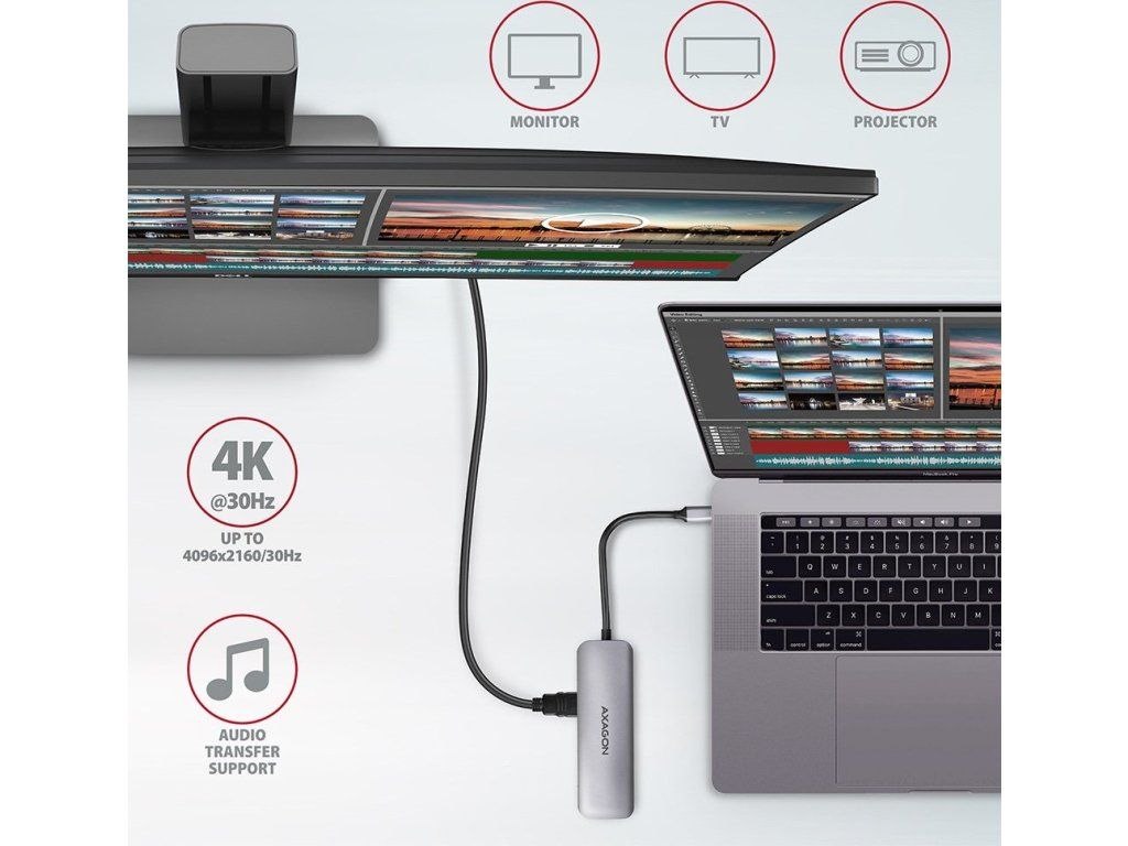 HDMI výstup poskytuje kvalitní obraz až do rozlišení 4K/30Hz Ultra HD a podporuje přenos vícekanálového zvuku. Podporována jsou také oblíbená hráčská rozlišení WQHD 2560 x 1440 při 60Hz nebo FullHD 1920 x 1080 při 60, 100 a 120Hz max. Pro správné fungování video výstupu je nutné, aby USB-C port notebooku podporoval DisplayPort Alternate Mode (DP Alt Mode) nebo Thunderbolt 3.