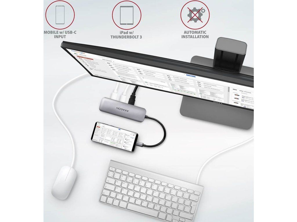 Replikátor portů je ideálním doplňkem pro notebooky bez USB-A konektorů, čtečky karet a video výstupu. V hubu lze využít Vaše stávající USB periferie bez nutnosti pořizování nových. Díky funkcím Plug and Play a Hot Plug je samotné zapojení hubu velmi jednoduché bez složité instalace a také lze jednoduše připojovat a odpojovat periferie za běhu počítače. Rozbočovač se nezalekne ani připojení k telefonům s USB-C konektorem. K telefonu tak připojíte například flash disk, klávesnici, myš, monitor, TV nebo projektor.