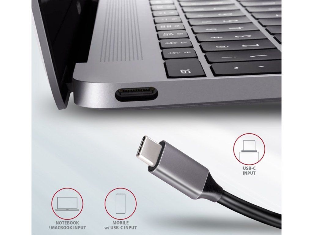 USB-C konektor je vyhrazen pouze pro napájení a současné dobíjení telefonů nebo notebooků pomocí technologie Power Delivery 3.0 výkonem až 100W. Do hubu zapojíte USB-C Power Delivery nabíječku a hub připojíte k notebooku. Tím také uvolníte jeden USB-C port. Podmínkou je notebook s podporou nabíjení z USB-C portu pomocí Power Delivery a vhodná PD nabíječka.