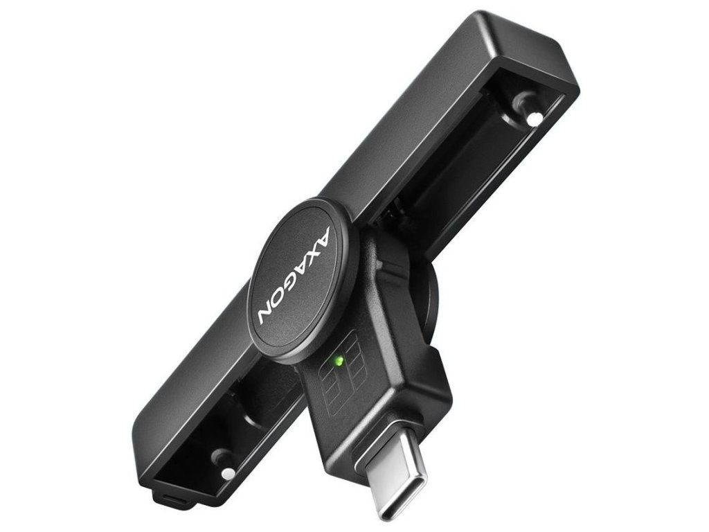 Skládací kapesní čtečka Smart card / ID card AXAGON CRE-SMPC PocketReader s USB-C 480Mbps rozhraním. Je vhodná zejména jako čtečka občanských průkazů pro použití s mobilními telefony, které disponují USB-C vstupem. Moderní oboustranný USB-C konektor usnadňuje použití čtečky, kdy odpadá potřeba správné orientace konektoru při zapojení do počítače nebo telefonu.