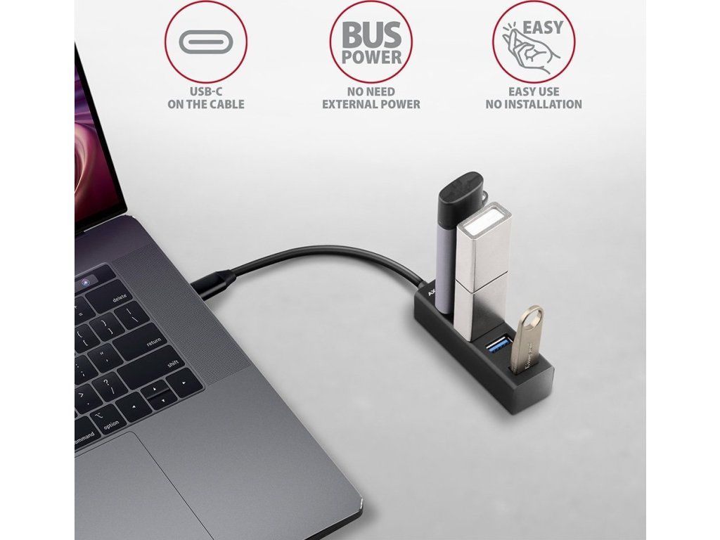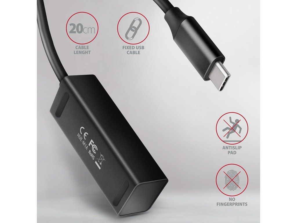 Miniaturní kovový USB-C 3.2 Gen 1 hub AXAGON HUE-M1C snadno a rychle připojí k notebooku nebo počítači až čtyři USB zařízení současně. Kovové tělo hubu je vyrobeno z hliníku a zajišťuje tak dokonalou mechanickou ochranu pro časté přenášení. Elegantní, jemně strukturovaný povrch brání nežádoucím otiskům. Gumové nožky zabraňují klouzání hubu po stole. Napevno uchycený USB kabel délky 20 cm je ideální pro uživatele mobilních zařízení.