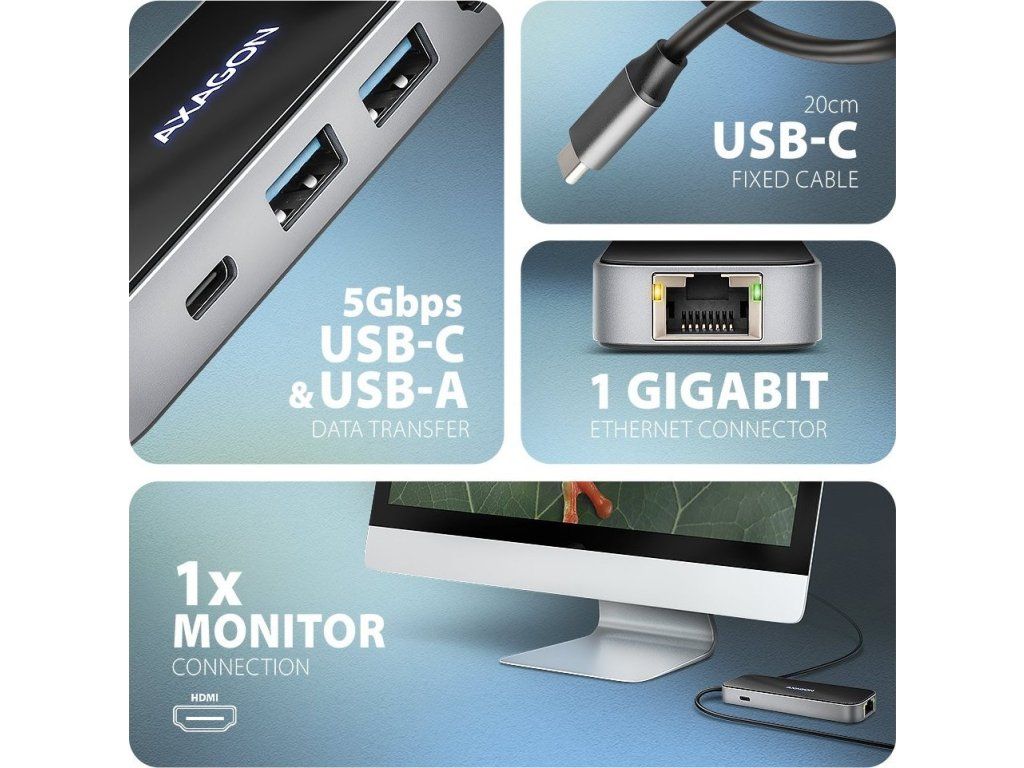 AXAGON multi 6in1 USB-C hub / HMC-6GLN / USB 3.2 Gen1 / PD 100W / 1x USB-C / 2x USB-A / HDMI / RJ-45 / 20cm