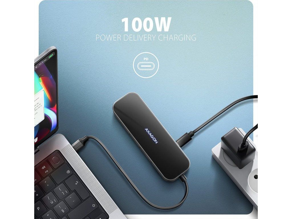 Další z USB-C konektorů je vyhrazen pouze pro nabíjení telefonů nebo notebooků pomocí technologie Power Delivery 3.0 výkonem až 100W. Do hubu zapojíte vhodnou USB-C Power Delivery nabíječku a hub připojíte k notebooku s podporou Power Delivery. Tím také uvolníte jeden USB-C port.