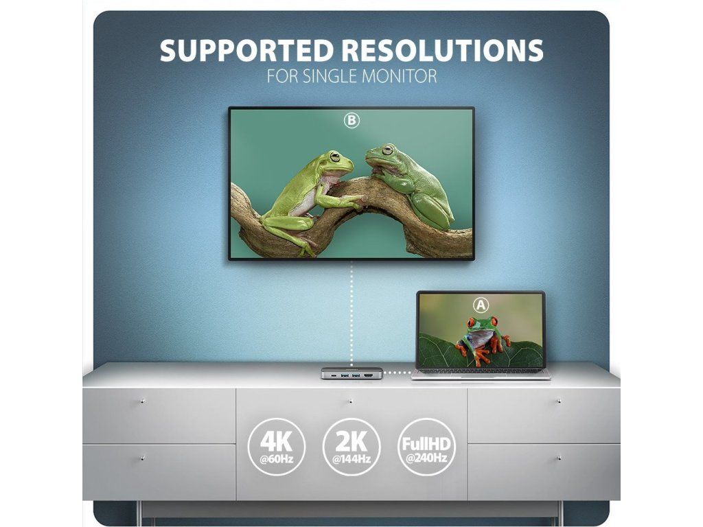 • Pro dosažení maximálních hodnot rozlišení a frekvencí na video výstupech je nutné hub zapojit do USB-C portu s podporou DisplayPort Alternate Mode (DP Alt Mode) verze min. 1.4 nebo do USB-C portu s podporou min. Thunderbolt 3. Dále je nutný vhodný aktualizovaný OS a aktuální grafické ovladače.