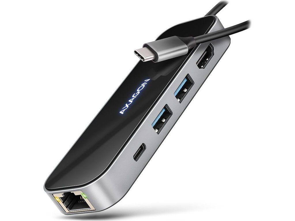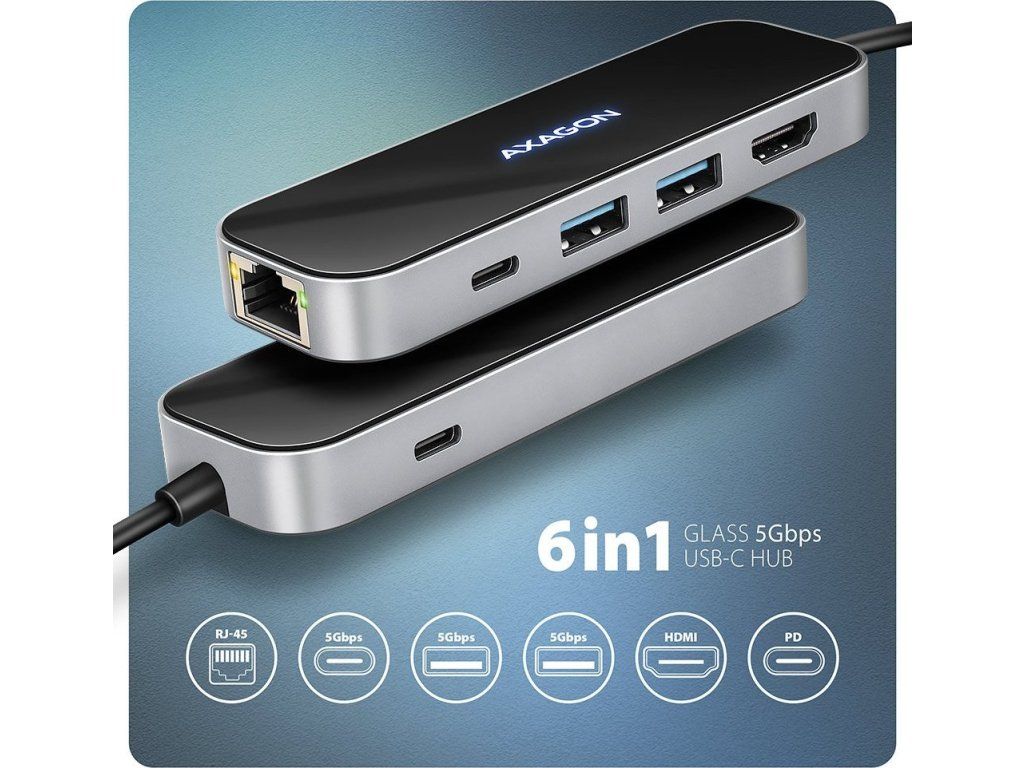Multiportový USB-C 5Gbps AXAGON HMC-6GLN GLASS 6in1 hub rozšíří váš notebook, počítač nebo telefon o šest portů. Váš notebook připojíte k hubu přes 20 cm dlouhý USB-C kabel. Okamžitě tak máte k dispozici připojení pro monitor, tři USB zařízení a konektor RJ-45 pro Gigabitovou ethernet síť. Zároveň získáte možnost napájení notebooku pomocí technologie Power Delivery. Replikátor portů vám poskytne jednoduchou a skladnou dokovací stanici 6v1 pro moderní notebooky.