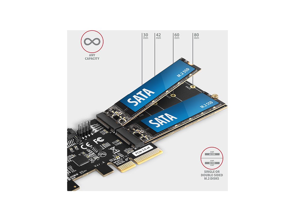 PCI-Express řadič AXAGON PCES-SA4M2 rozšíří stolní PC o dva SATA III porty a dva sloty pro SATA M.2 disky s přenosovou rychlostí až 6Gb/s. Kombinace dvouportového SATA III řadiče a dvou SATA M.2 slotů dělá z karty velice užitečné zařízení pro rozšíření vašeho počítače. Snadno tak připojíte až čtyři disky např. dva 3.5“ disky nebo optické mechaniky a dva SATA M.2 disky.