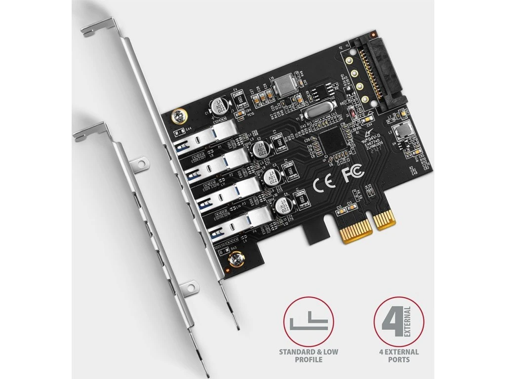 AXAGON PCEU-43RS, PCIe řadič, 4x USB 3.2 Gen 1 port, 5 Gbps, napájení z PCIe nebo SATA, SP & LP