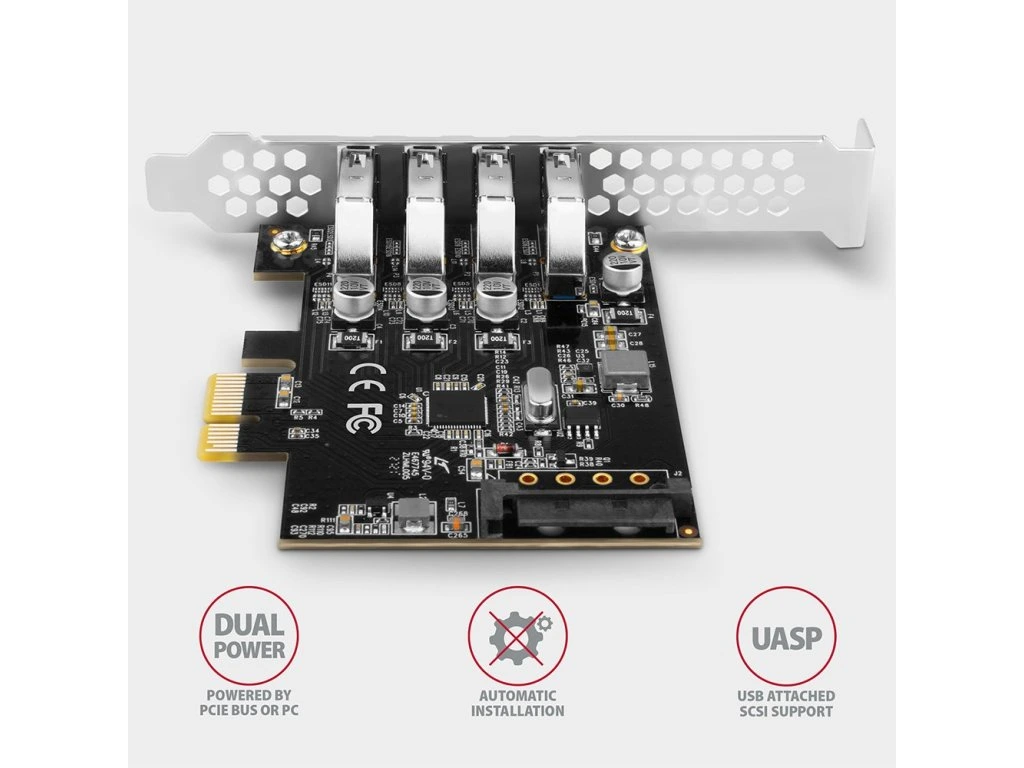 Všechny čtyři SuperSpeed USB porty jsou vyvedeny na záslepku. Duální napájení řadiče umožňuje standardní napájení řadiče a připojených USB periferií po PCI-Express sběrnici i volitelné napájení ze zdroje PC přes napájecí SATA konektor.
