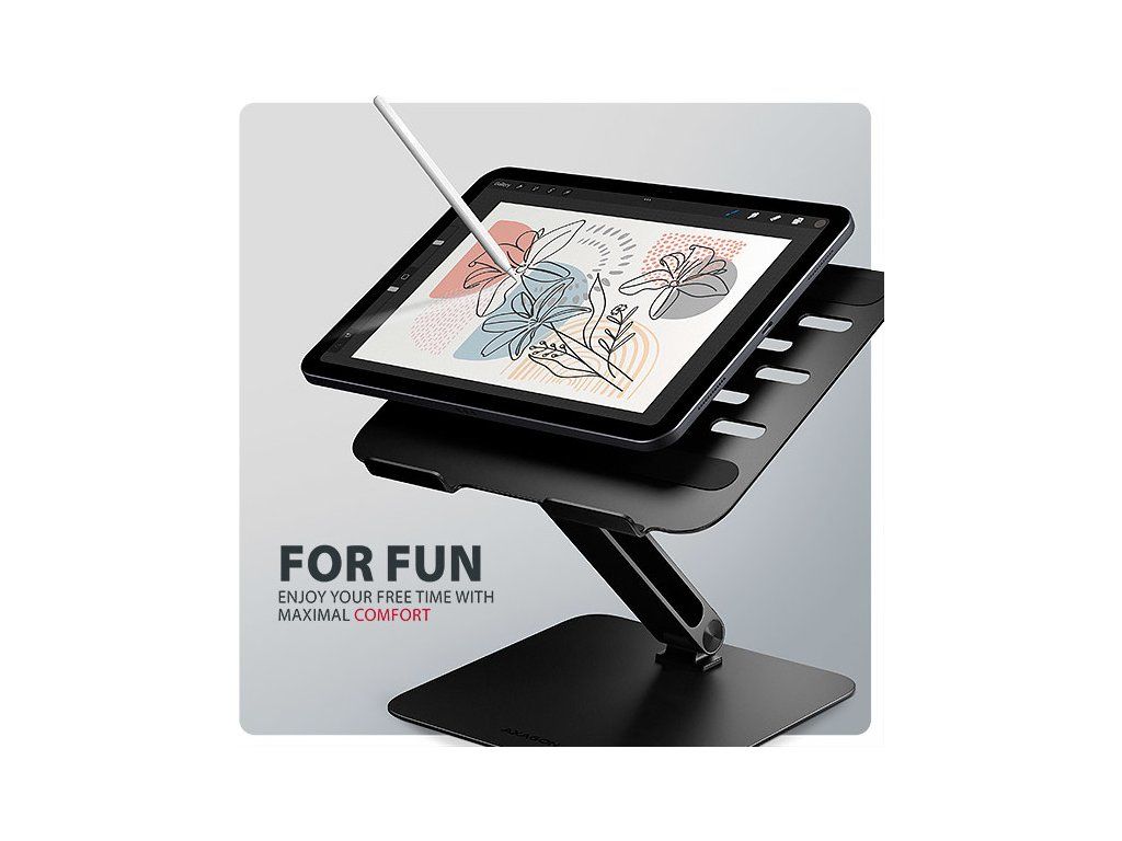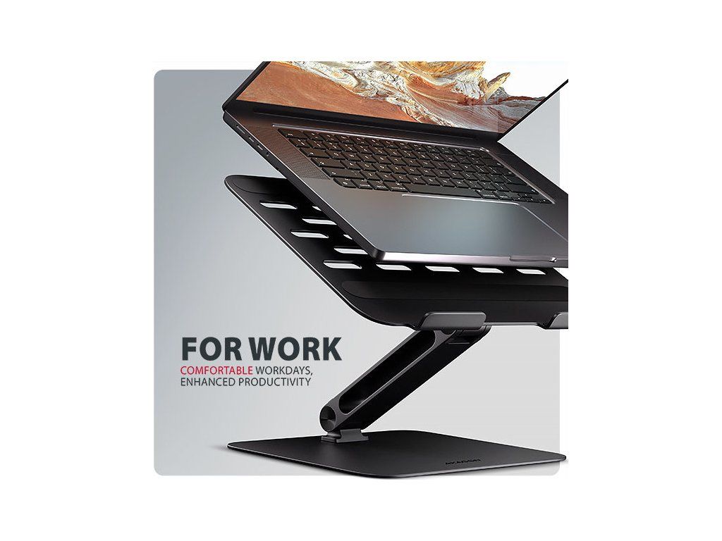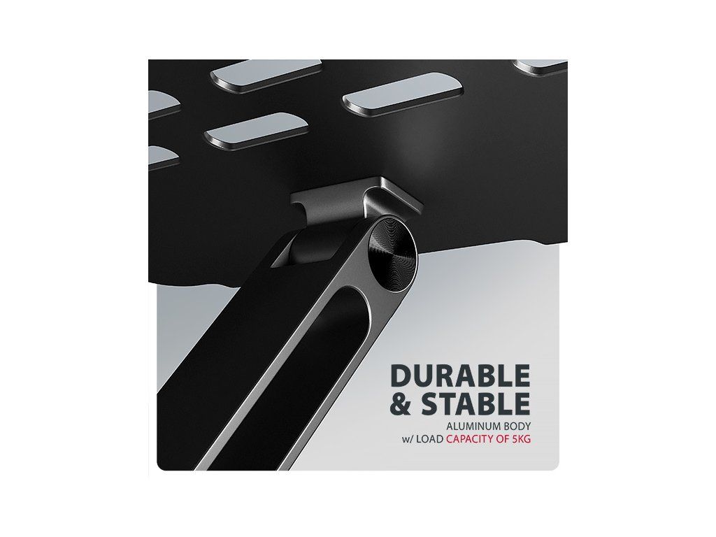 Podstavec je vyroben z robustních hliníkových odlitků garantujících dlouhou životnost a spolehlivost. Díky protiskluzové úpravě se nemusíte obávat nežádoucích pohybů – vaše zařízení zůstane pevně na svém místě, a to bez poškození povrchu notebooku či podložky. Tyto pečlivě navržené vlastnosti zaručují perfektní stabilitu pro váš notebook, tablet nebo dokonce oblíbenou knihu, což vám poskytne klid a pohodlí při každodenním používání.
