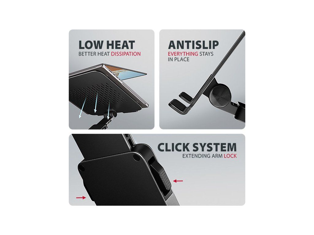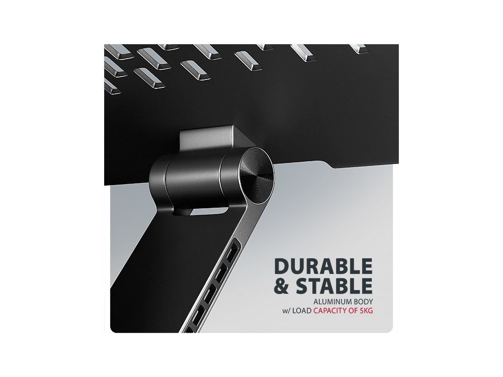 Podstavec pro notebook je vyroben z robustních hliníkových odlitků garantujících dlouhou životnost a spolehlivost. Díky protiskluzové úpravě zůstane vaše zařízení bezpečně na svém místě bez rizika nechtěných pohybů, aniž by došlo k jakémukoliv poškození povrchu notebooku nebo podložky. Tyto pečlivě navržené vlastnosti zaručují perfektní stabilitu pro váš notebook, tablet nebo oblíbenou knihu, což vám poskytne klid a pohodlí při každodenním používání.