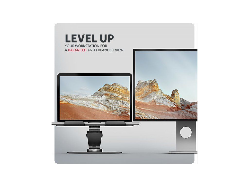 360° mechanismus umožňuje otočení celého ramene s notebookem okolo své osy. Tato funkce zajišťuje maximální flexibilitu – snadno změníte orientaci notebooku, aniž byste museli stojan přemisťovat. To oceníte zejména při práci v omezených prostorech, nebo při sdílení obrazovky notebooku při obchodních jednáních, poradách nebo prezentacích.