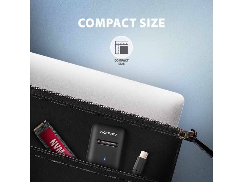 Díky malým rozměrům může být kdykoli pohotově po ruce. Adaptér nebrání odvodu tepla z disku, to prodlužuje jeho životnost a zároveň brání před zpomalováním rychlosti disku, tzv. „Thermal Throttling“. Tuto redukci z USB-C na M.2 disk je možné použít jak s počítači a notebooky, tak s mobilními telefony a tablety.