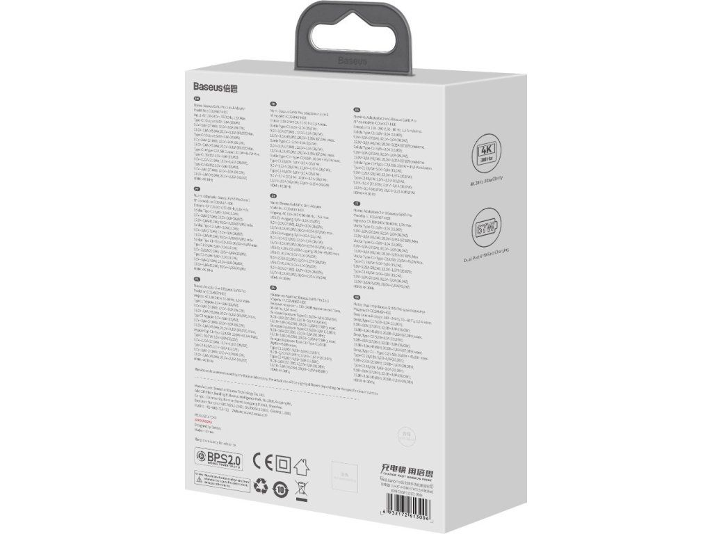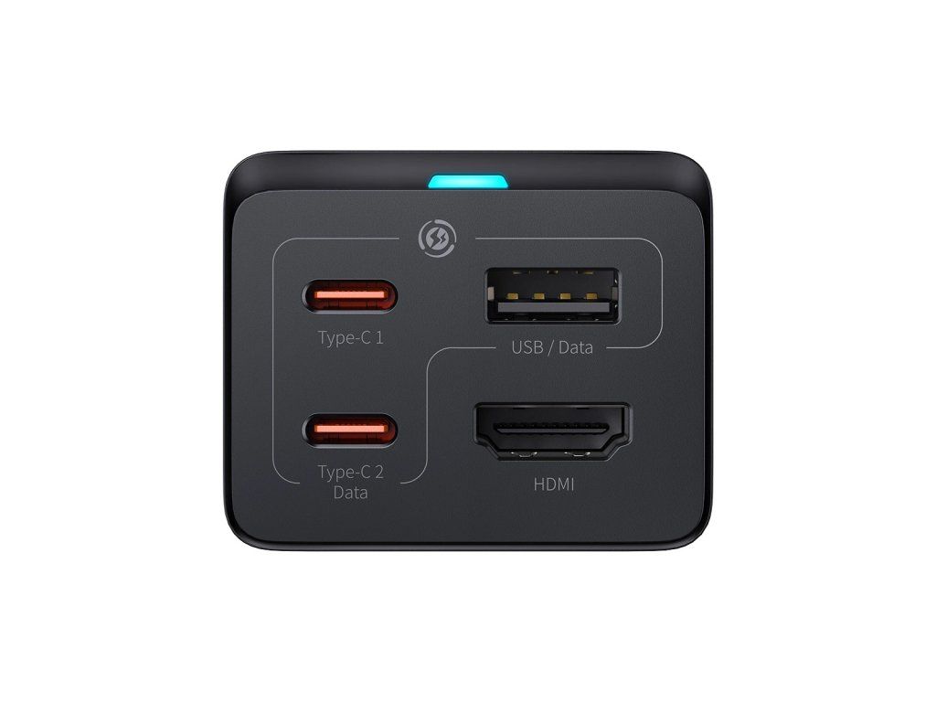 Rychlostní stolní nabíjecí adaptér Baseuss technologií GaN. Vyroben z kvalitního pevného polykarbonátu, se třema výstupními porty s výkonem až 65W. Adaptér disponuje ochranou proti zkratu, přepětí, přetížení a přehřátí. Najednou můžete nabíjet 2 zařízení - ve dvou USB-C portech. USB-A port slouží pro připojení USB zařízení (klávesnice, myš...). Funguje zároveň i jako rozbočovač. Pomocí HDMI portu můžete prezentovat obsah na větší obrazovce.