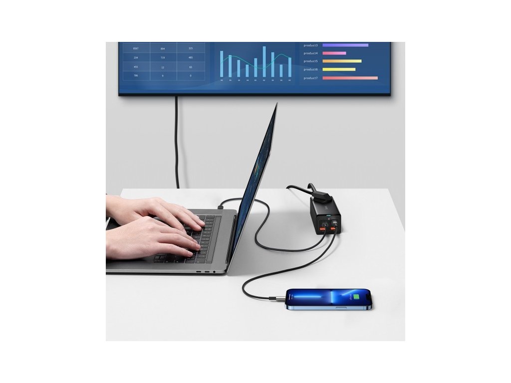 Vysokorychlostní stolní nabíjecí adaptér Baseuss technologií GaN. Vyroben z kvalitního pevného polykarbonátu, se pěti výstupními porty s výkonem až 100W. Adaptér disponuje ochranou proti zkratu, přepětí, přetížení a přehřátí. Najednou můžete nabíjet 5 zařízení - ve dvou USB-C portech, dvou USB-A portech a AC zásuvce.