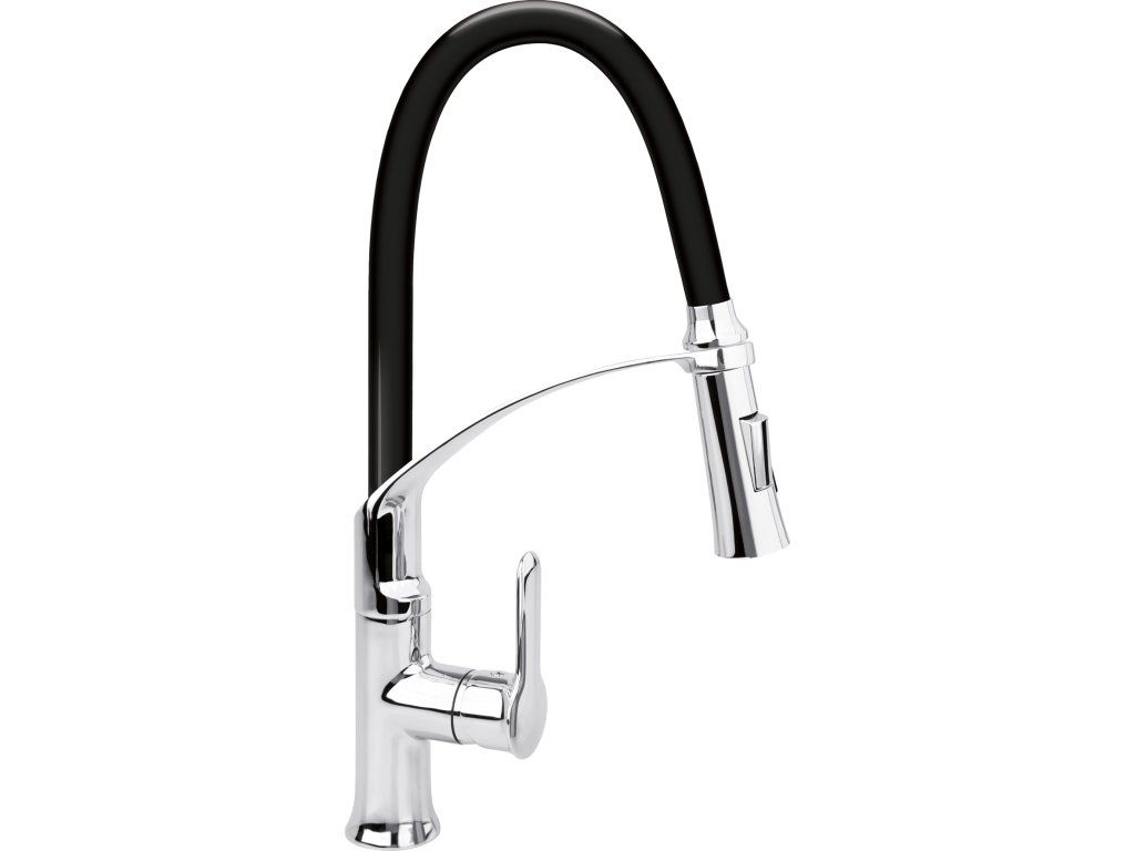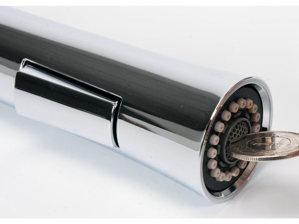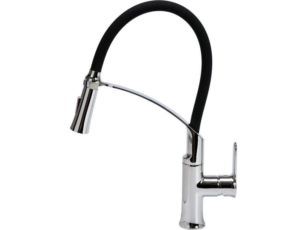 Dřezová baterie z mosazi s jedinečnou konstrukcí s ohebnou hadicí a nastavitelnou tryskou.