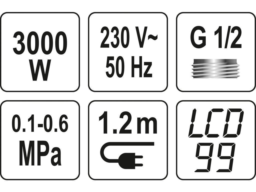 Průtokový ohřívač o výkonu 3000W, umožňuje ohřát vodu na 60 ° C za 5 sekund. Snadno čitelný LED displej, který umožňuje kontrolovat teplotu vody.