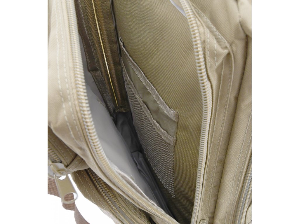 Z čelní strany a na bocích je opatřen Molle systémem pro uchycení dalšího vybavení. Kapsy jsou osazeny bytelným dvoucestným zipem. Vnitřní kapsy a sítěná kapsa jsou doplněné o poutka pro bezpečné nošení drobných předmětů. Jedna z vnitřních kapes je opatřena klasickým zipem a zadní větraná kapsa je opatřena suchým zipem.