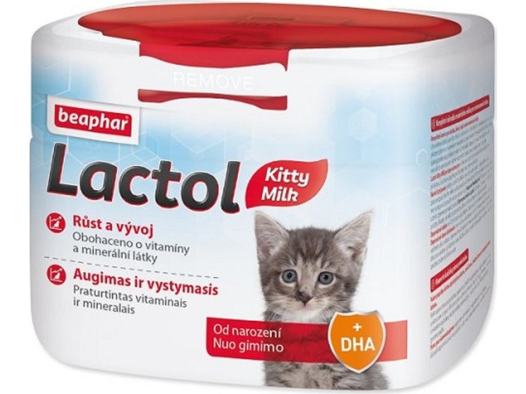 Komplexní náhražka mateřského mléka pro kočky.Náhražka mateřského mléka pro osiřelá koťata, zvýšený obsah proteinu, s cennými vitamíny, minerálními látkami, taurinem, biotinem & DHA, vhodné i pro oslabené, starší březí nebo kojící kočky. Náhražka mateřského mléka, kterou lze podávat od narození až po odstavení. Zároveň lze mléko podávat i jako nutrinápoj kočkám, které jsou vystaveny vysokým nárokům, starším jedincům nebo kojícím i březím kočkám. Běžné mléko neobsahuje dostatečné množství proteinů a olejů, které mladá zvířata během prvních dní života nutně potřebují. Beaphar Lactol má vyšší obsah proteinů, kolem 32%. Navíc obsahuje taurin a biotin, které jsou pro kočky velmi důležité. Taurin přispívá ke zlepšení zraku a podporuje i činnost srdečního svalu. Biotin pomáhá získat zdravou pokožku a krásnou, lesklou srst. DHA je důležité pro kognitivní schopnosti a zrak novorozených koťat. Přispívá také k urychlují tréninku, socializaci a poslušnost. Toto mléko obsahuje i cenné aminokyseliny, vitamíny, minerální látky a stopové prvky. Věnujte svému miláčkovi láskyplnou péči již od narození!Složení: mléko a mléčné výrobky, oleje a tuky, minerální látkyDeklarované jakostní znaky: hrubý protein 32%, hrubá vláknina 0%, hrubé oleje a tuky 24%, hrubý popel 7%, vlhkost 3,5%