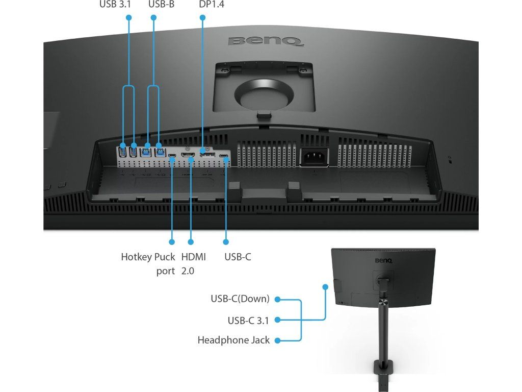 Součástí balení je HDMI, DisplayPort, USB, USB-C kabel a dálkový ovladač Hotkey Puck G2, který slouží k rychlému přepínání nastavitelných módů obrazu bez nutnosti vstupu do menu. Kromě několika funkčních tlačítek obsahuje tento ovladač také otočné kolečko, které umožňuje rychlou úpravu jasu, kontrastu nebo hlasitosti.