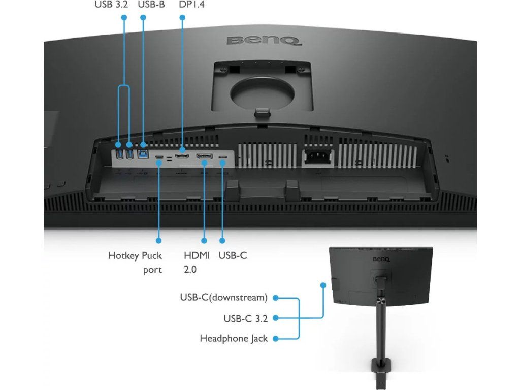 Součástí balení jsou kabely DisplayPort, HDMI, USB a USB-C a dálkový ovladač Hotkey Puck G2, který slouží k rychlému přepínání nastavitelných módů obrazu bez nutnosti vstupu do menu. Kromě několika funkčních tlačítek obsahuje tento ovladač také otočné kolečko, které umožňuje rychlou úpravu jasu, kontrastu nebo hlasitosti.