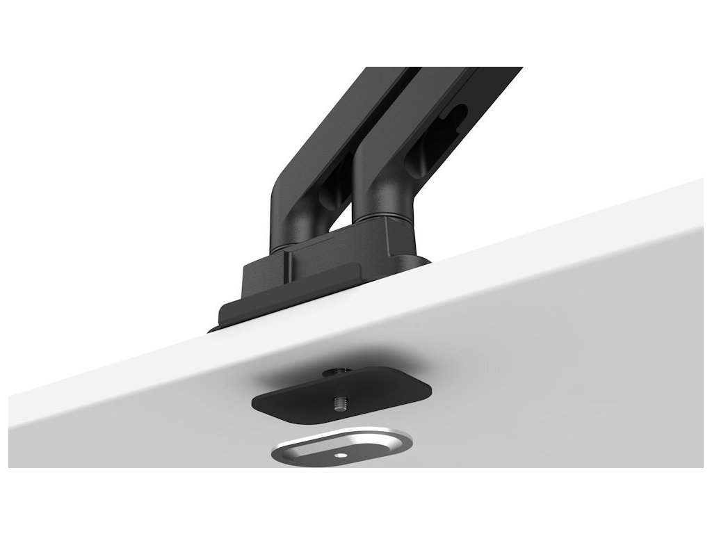 Konstrukce využívá optimalizovanou nakloněnou strukturu s plynovými pružinami testovanými na 25 000 cyklů, což zajišťuje spolehlivou podporu a zabraňuje prověšení monitorů během dlouhodobého používání. Součástí balení jsou ocelové výztužné desky pro ochranu tenkých, skleněných a jiných křehkých stolních desek.