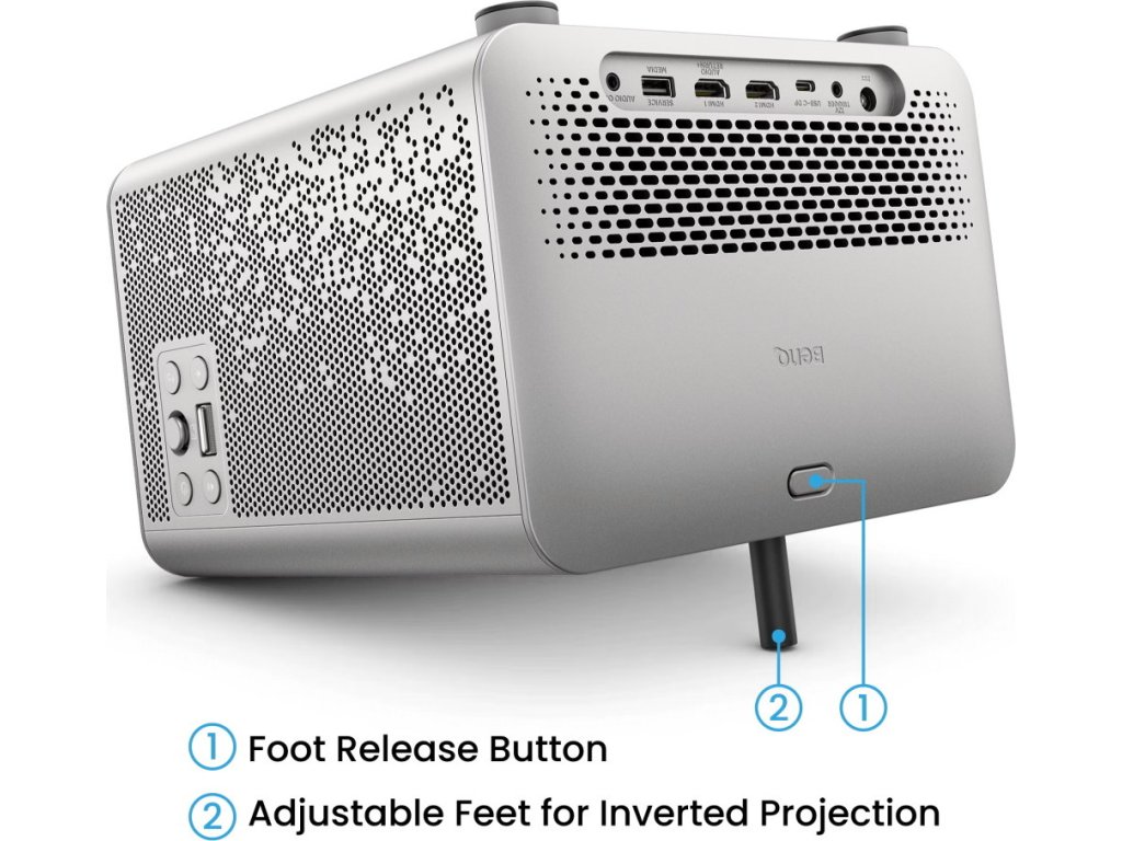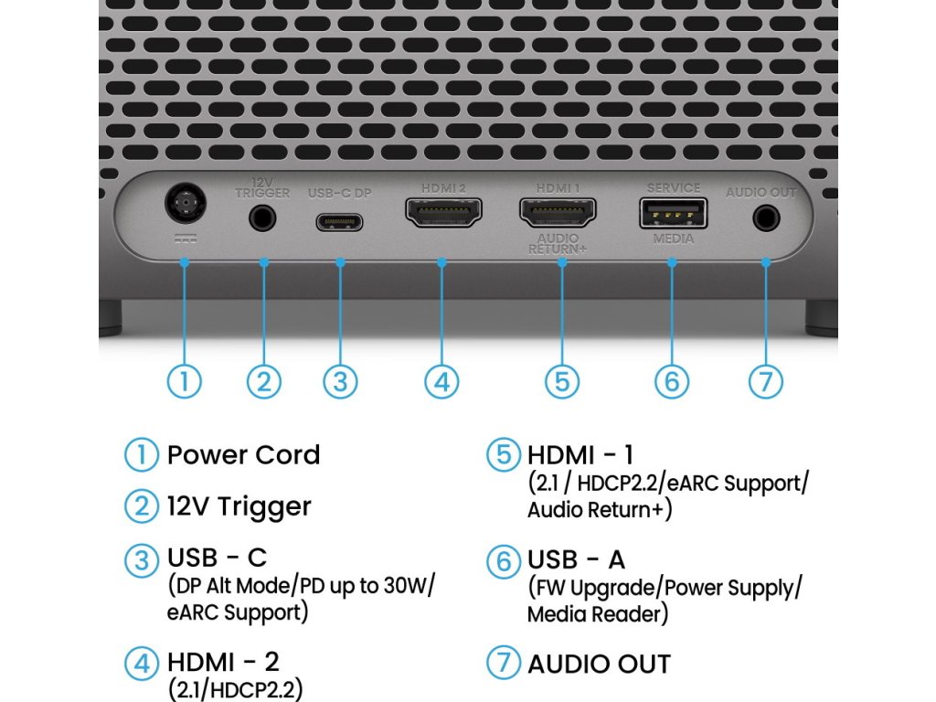 Kompletní konektivita zahrnuje 2× HDMI 2.1, USB-C s DisplayPort alternativním režimem, USB-A 2.0, 3,5 mm audio výstup a 12V trigger. Podporuje rozlišení od VGA až po 4K UHD při frekvencích 23–60 Hz.