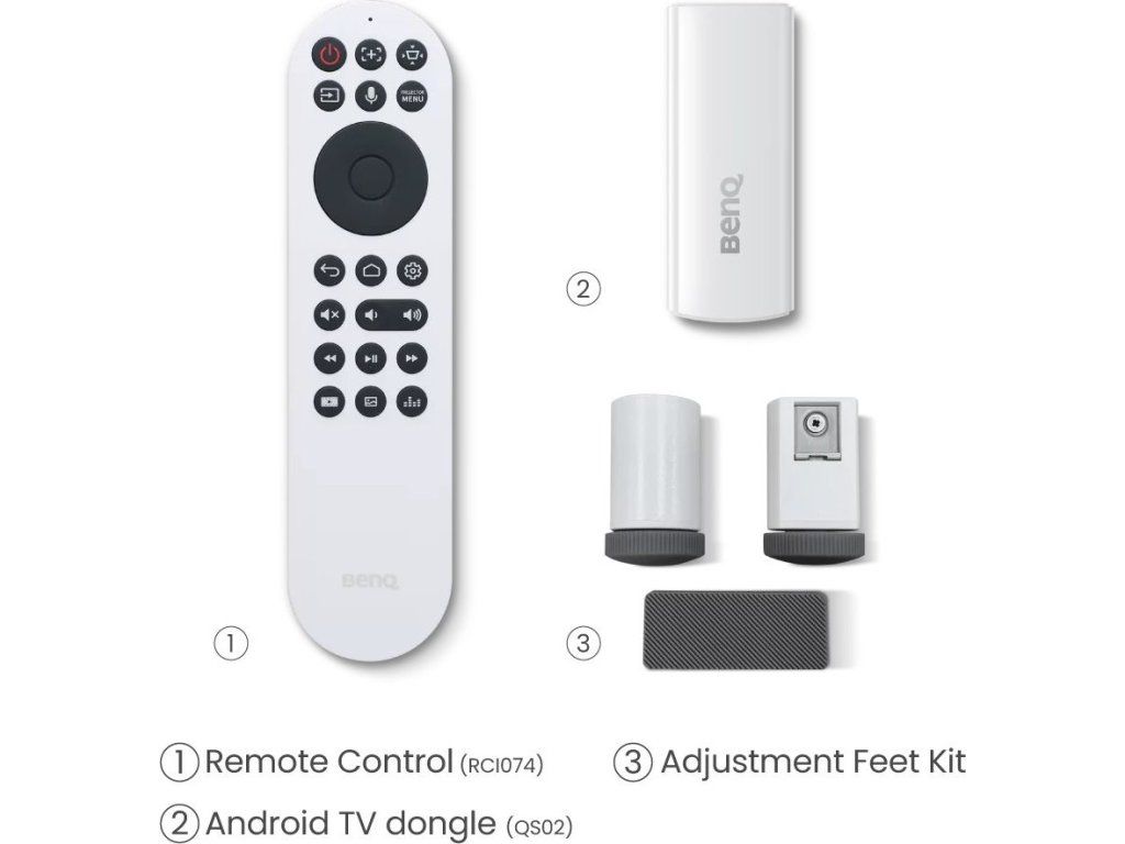 Součástí balení je dálkový ovladač (včetně baterií) a modul QS02 s Android TV.
