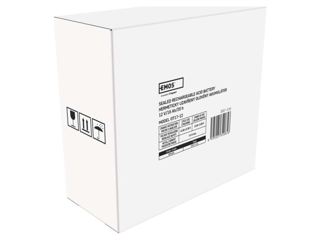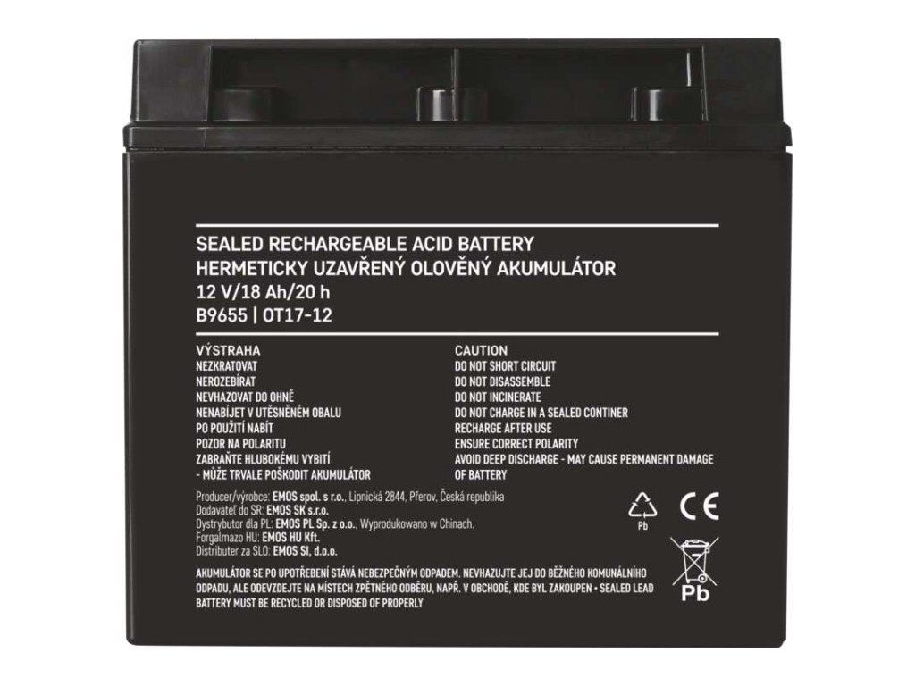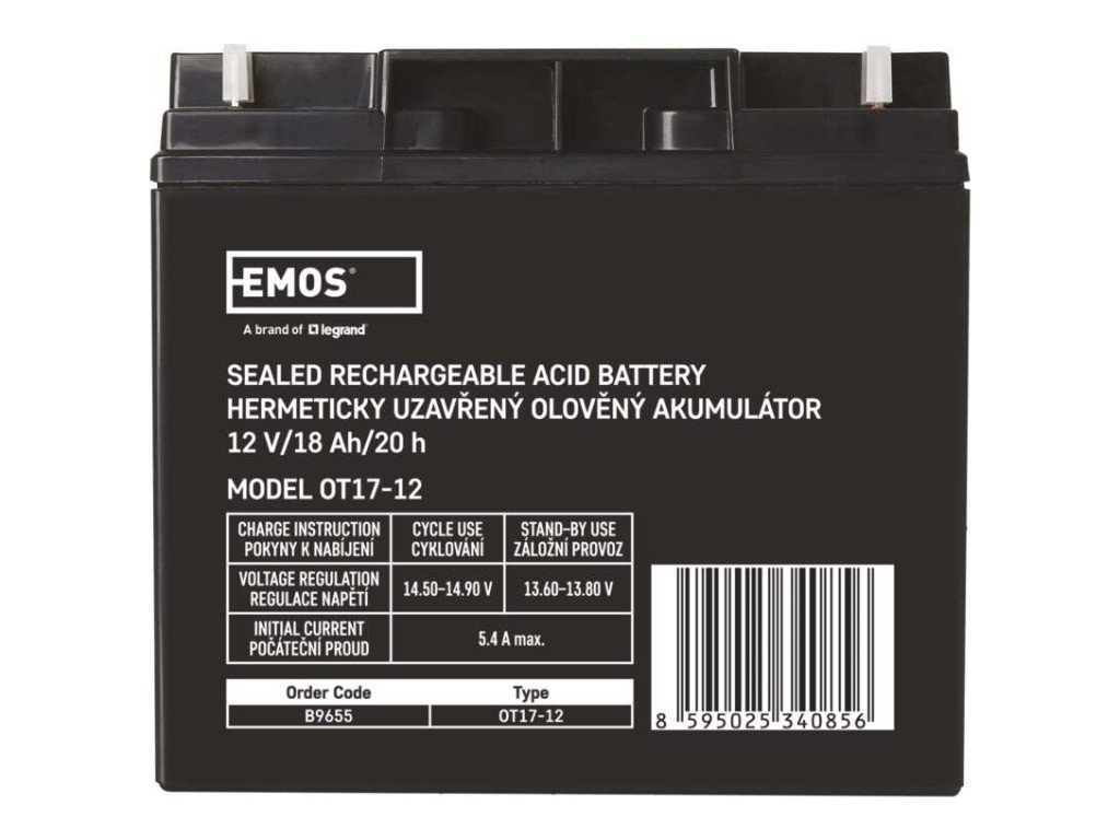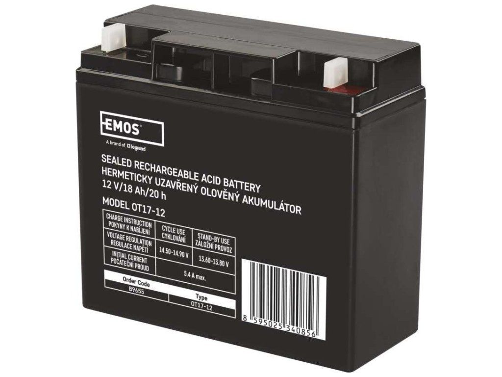 Akumulátor EMOS je vhodný jako náhradní baterie pro záložní zdroje UPS, RBC kity, elektronické systémy EZS, EPS, záložní systémy výtahů apod. Bezúdržbový, ventilem řízený olověný akumulátor v provedení AGM umožňuje být používán v libovolné poloze. Optimální životnost v záložních systémech je 5 let.Nabíjení baterie musí být prováděno vhodným napájecím zdrojem nebo nabíječem, který má hodnotu nabíjecího napětí 14,4 V pro 12 V akumulátory a 7,2 V pro 6 V akumulátory. V případě, že nabíječ nebo napájecí zdroj nemá tyto parametry, tak dochází k neúplnému nabíjení a dochází k tomu, že akumulátor bude rychle spotřebován a v krajním případě zničen. V tomto případě nelze uznat reklamaci akumulátoru.
