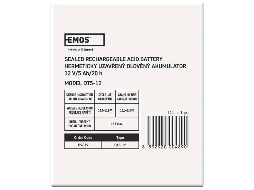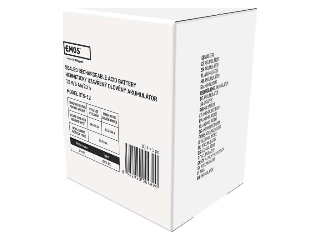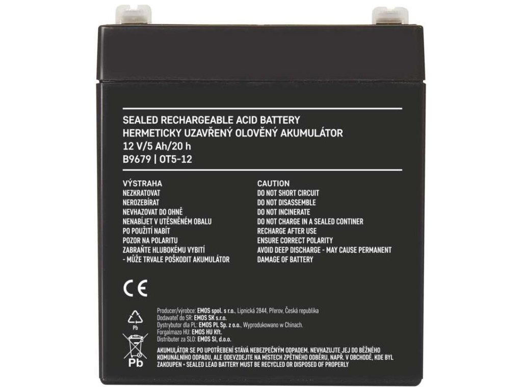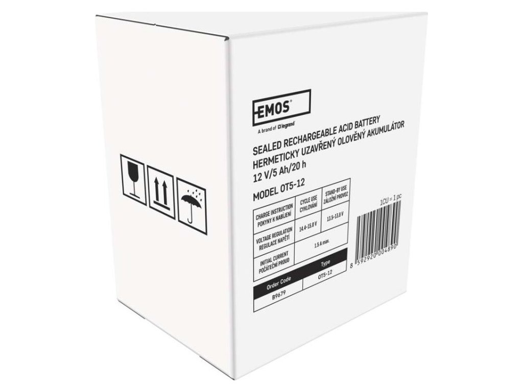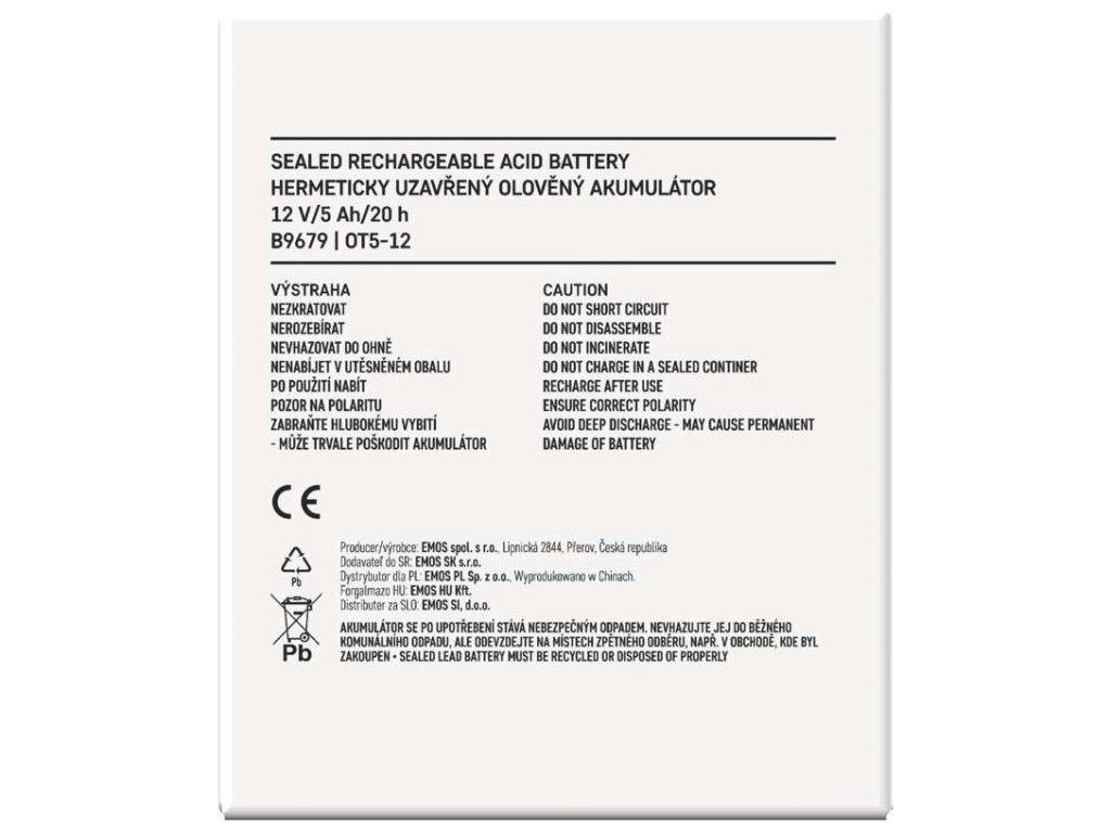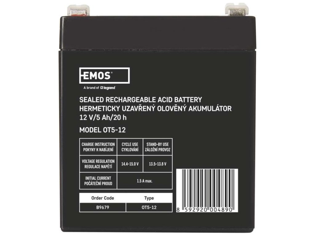 Akumulátor EMOS je vhodný jako náhradní baterie pro záložní zdroje UPS, RBC kity apod. Bezúdržbový, ventilem řízený olověný akumulátor v provedení AGM umožňuje být používán v libovolné poloze.Optimální životnost v záložních systémech je 5 let.Nabíjení baterie musí být prováděno vhodným napájecím zdrojem nebo nabíječem, který má hodnotu nabíjecího napětí 14,4 V pro 12 V akumulátory a 7,2 V pro 6 V akumulátory. V případě, že nabíječ nebo napájecí zdroj nemá tyto parametry, tak dochází k neúplnému nabíjení a dochází k tomu, že akumulátor bude rychle spotřebován a v krajním případě zničen. V tomto případě nelze uznat reklamaci akumulátoru.