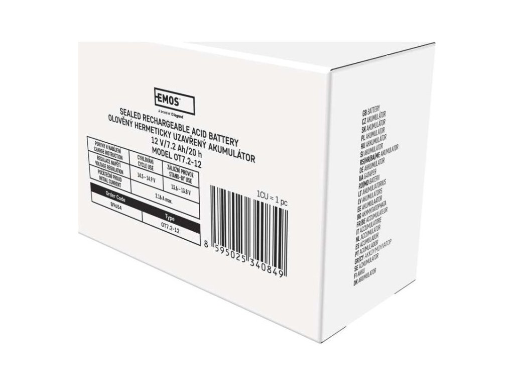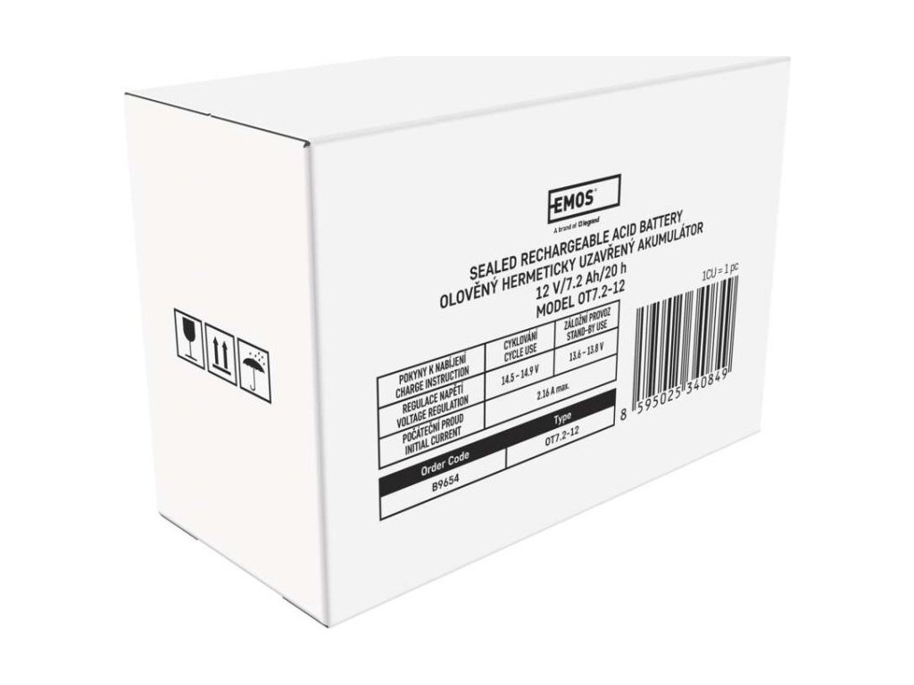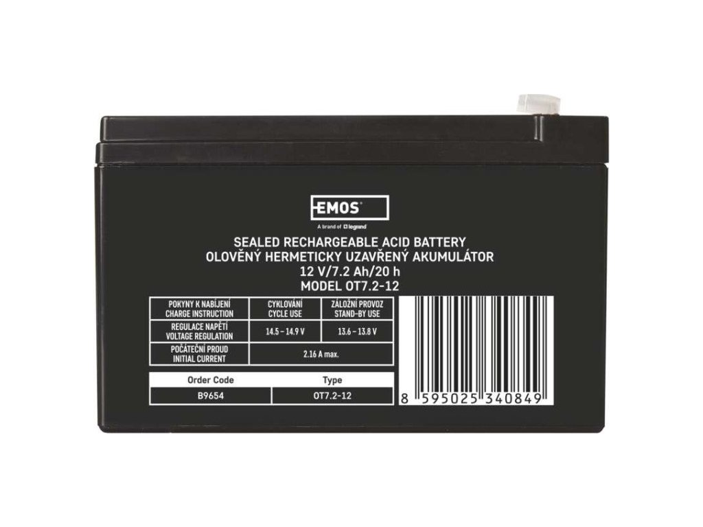 Akumulátor EMOS je vhodný jako náhradní baterie pro elektronické systémy - EZS, EPS (ústředny Jablotron a Paradox), záložní systémy výtahů apod. Bezúdržbový, ventilem řízený olověný akumulátor v provedení AGM umožňuje být používán v libovolné poloze. Optimální životnost v záložních systémech je 5 let.Nabíjení baterie musí být prováděno vhodným napájecím zdrojem nebo nabíječem, který má hodnotu nabíjecího napětí 14,4 V pro 12 V akumulátory a 7,2 V pro 6 V akumulátory. V případě, že nabíječ nebo napájecí zdroj nemá tyto parametry, tak dochází k neúplnému nabíjení a dochází k tomu, že akumulátor bude rychle spotřebován a v krajním případě zničen. V tomto případě nelze uznat reklamaci akumulátoru.