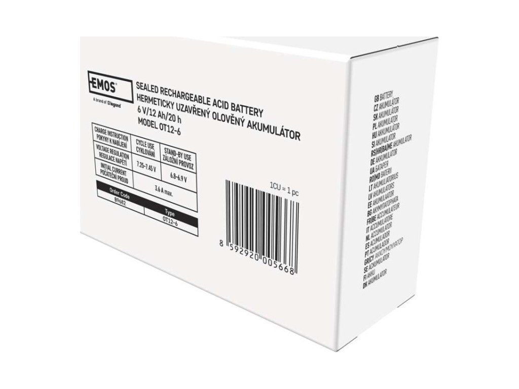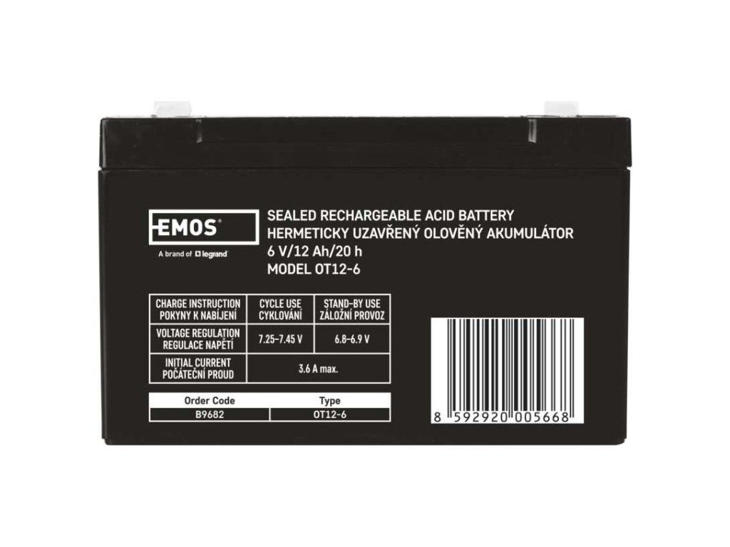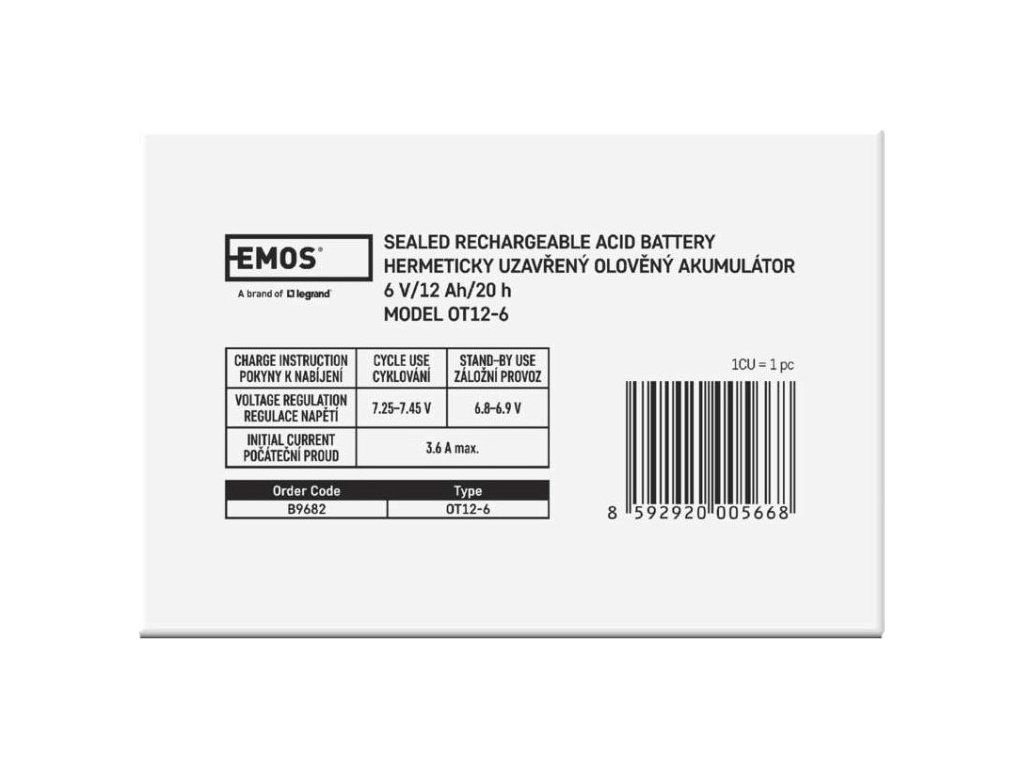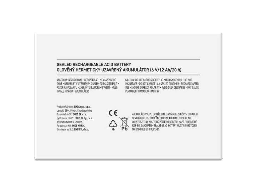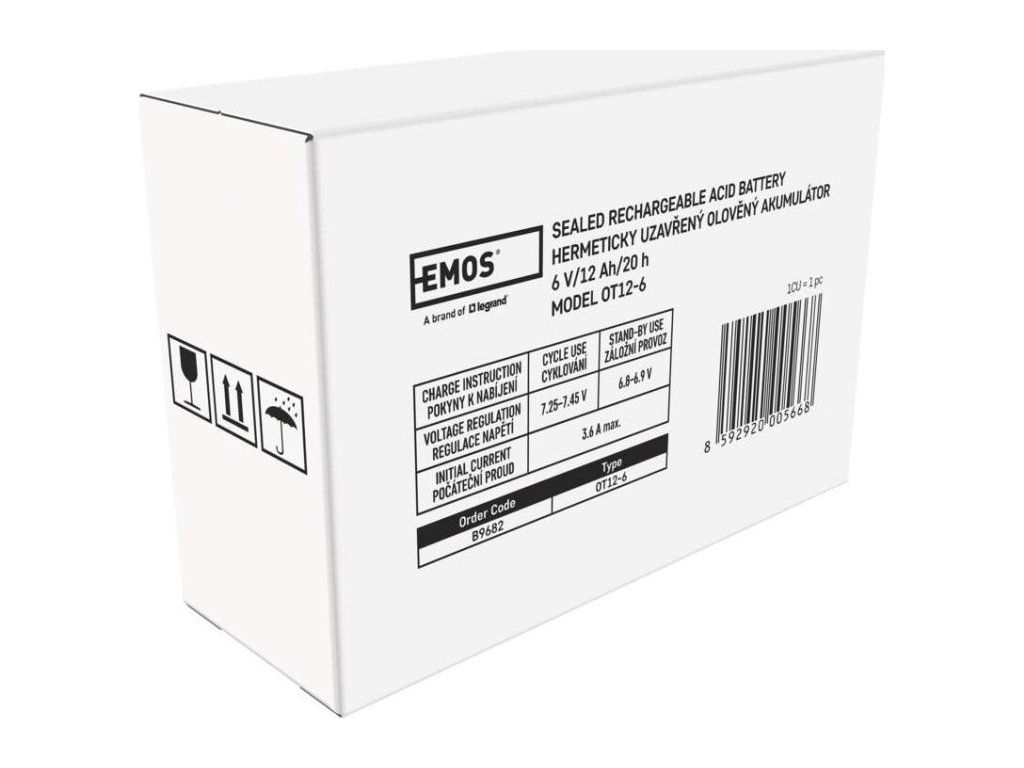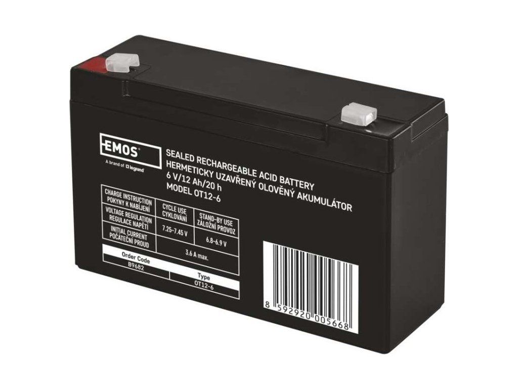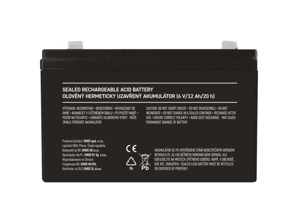 Akumulátor EMOS je vhodný jako náhradní baterie pro záložní zdroje UPS, RBC kity apod. Bezúdržbový, ventilem řízený olověný akumulátor v provedení AGM umožňuje být používán v libovolné poloze. Optimální životnost v záložních systémech je 5 let.Nabíjení baterie musí být prováděno vhodným napájecím zdrojem nebo nabíječem, který má hodnotu nabíjecího napětí 14,4 V pro 12 V akumulátory a 7,2 V pro 6 V akumulátory. V případě, že nabíječ nebo napájecí zdroj nemá tyto parametry, tak dochází k neúplnému nabíjení a dochází k tomu, že akumulátor bude rychle spotřebován a v krajním případě zničen. V tomto případě nelze uznat reklamaci akumulátoru.