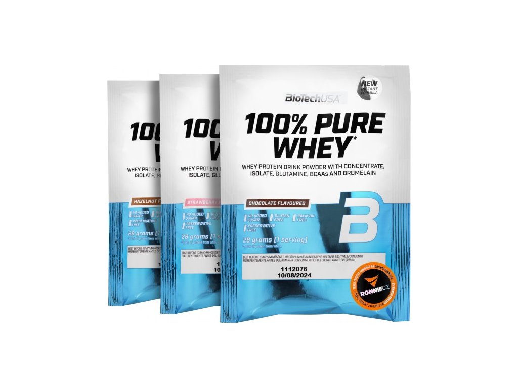 100 % Pure Whey je syrovátkový protein s vysokým obsahem bílkovin (až 76 %), BCAA, s minimálním obsahem tuku a sacharidů bez přidaného cukru, neobsahuje lepek ani aspartam. Díky šetrné výrobní technologii je v tomto produktu zachováno ideální aminokyselinové spektrum s vysokou biologickou hodnotou.