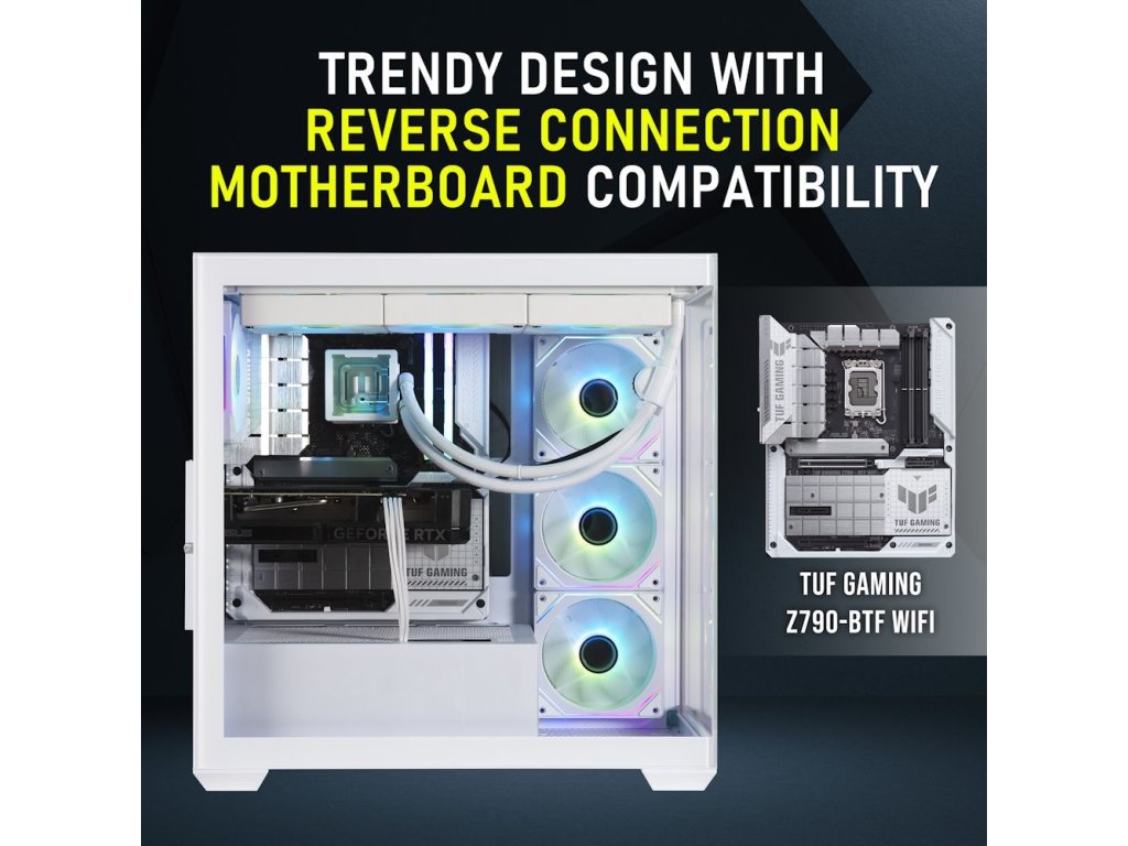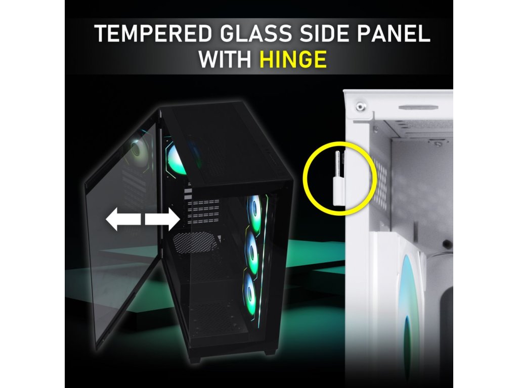 Herní počítačová skříň nabízí stylovou prosklenou bočnici i přední panel a prvotřídní kovovou konstrukci. Skříň je osazena čtyřmi ventilátory o velikosti 120 mm s RGB podsvícením. Potěší také možnost rozšíření o další 3 ventilátory. Samozřejmostí jsou také prachové filtry. Důmyslné řešení umožňuje pohodlné umístění až 360 mm dlouhého výměníku vodního chlazení na horní nebo boční straně. Ve skříni je dostatek prostoru pro chladič CPU do výšky až 170 mm a grafickou kartu o délce až 434,5 mm. Na horním panelu se nachází dva porty USB 3.0, jeden port USB-C, sluchátkový výstup a vstup pro mikrofon. Skříň je dodávána bez zdroje.