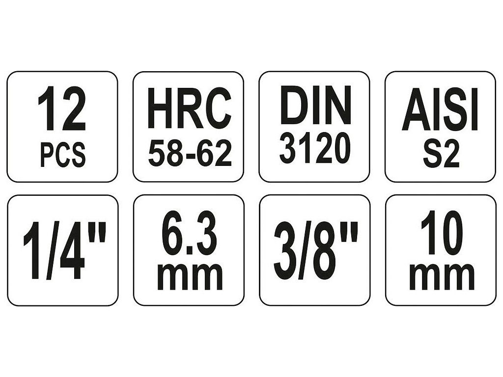 Délky bitů 37 a 48 mm, určené pro 1/4" a 3/8" ráčny. V sadě je kovový držák bitů a samotné bity T8-T55. Splňuje normu DIN 3120 pro vysoce-zatěžovatelné nástavce.