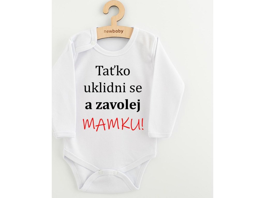 Originální bavlněné kojenecké body s dlouhým rukávem New Baby, s vtipným nápisem Taťko uklidni se a zavolej MAMKU! Barvy použité k potisku jsou certifikované a vhodné pro miminka. Je vyrobeno z příjemného a kvalitního materiálu, ve kterém se bude Vaše miminko cítit příjemně. Body má zapínáni na cvočky na ramínku a mezi nožičkami, což usnadňuje oblékání a přebalování. Dopřejte Vašemu miminku vyniknout v originálním body. Složení: 100% bavlna. Rozměry: obvod kolem hrudníku cca 36 cm, délka rukávu cca 18 cm, celková délka cca 32 cm.