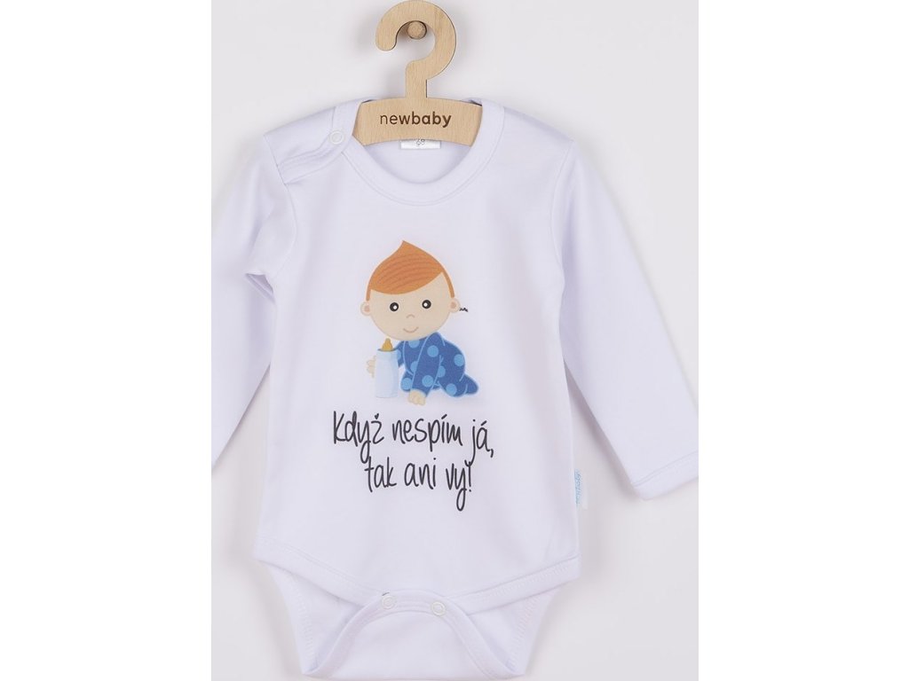 Originální bavlněné kojenecké body s dlouhým rukávem New Baby, s vtipným nápisem Když nespím já, tak ani vy! A obrázkem roztomilého chlapečka. Body má kolem krčku, nožiček a ručiček barevné lemování. Barvy použité k potisku jsou certifikované a vhodné pro miminka. Je vyrobeno z příjemného a kvalitního materiálu, ve kterém se bude Vaše miminko cítit příjemně. Body má zapínáni na cvočky na ramínku a mezi nožičkami, což usnadňuje oblékání a přebalování. Dopřejte Vašemu miminku vyniknout v originálním body. Složení: 100% bavlna. Rozměry: obvod kolem hrudníku cca 36 cm, délka rukávu cca 18 cm, celková délka cca 32 cm.