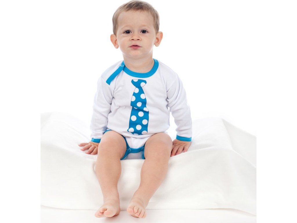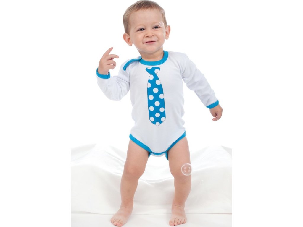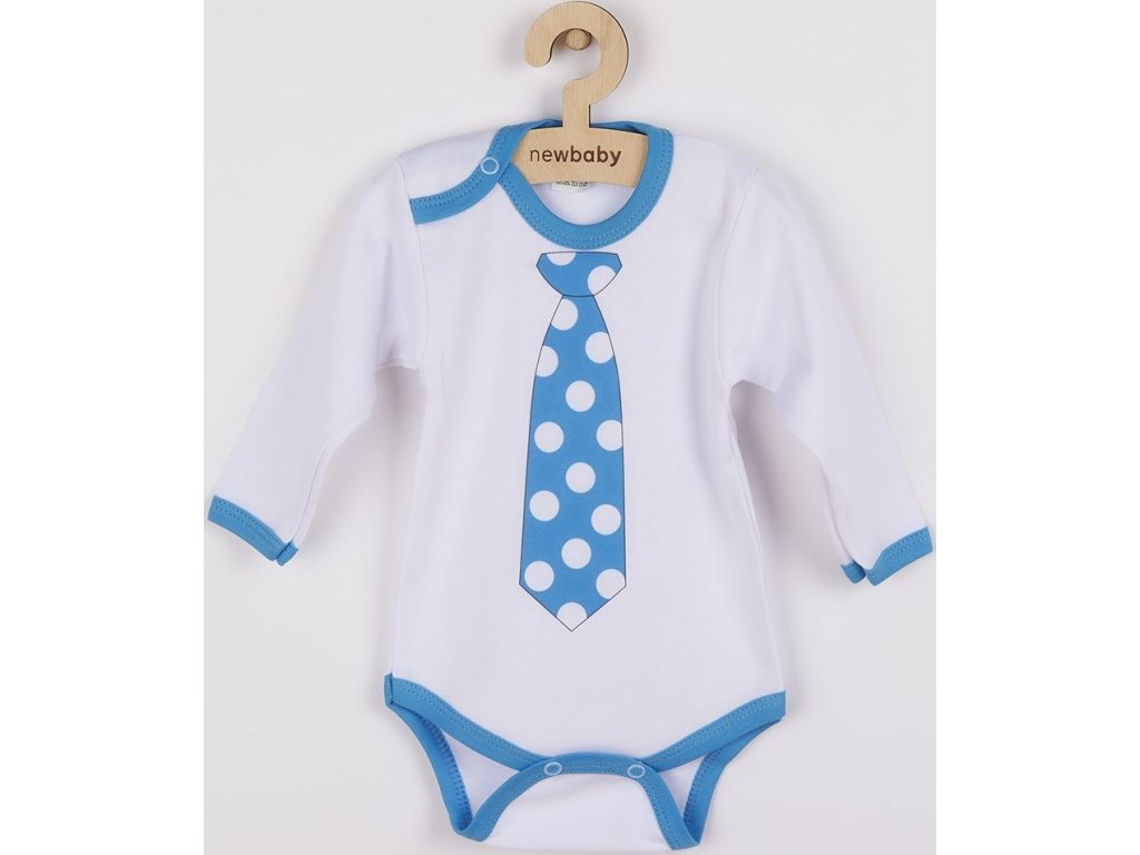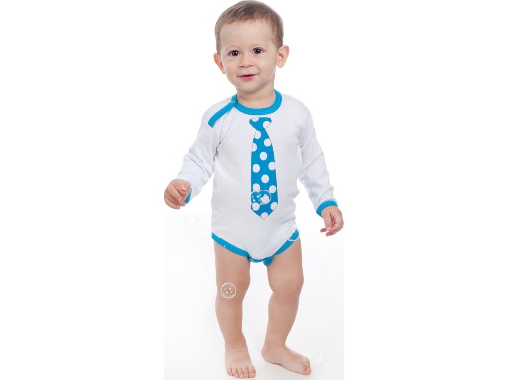 Originální bavlněné kojenecké body s dlouhým rukávem New Baby, s obrázkem tyrkysové kravaty zdobené puntíky. Body má kolem krčku, nožiček a ručiček barevné lemování. Barvy použité k potisku jsou certifikované a vhodné pro miminka. Je vyrobeno z příjemného a kvalitního materiálu, ve kterém se bude Vaše miminko cítit příjemně. Body má zapínáni na cvočky na ramínku a mezi nožičkami, což usnadňuje oblékání a přebalování. Dopřejte Vašemu miminku vyniknout v originálním body. Složení: 100% bavlna. Rozměry: obvod kolem hrudníku cca 46 cm, délka rukávu cca 24 cm, celková délka cca 40 cm.
