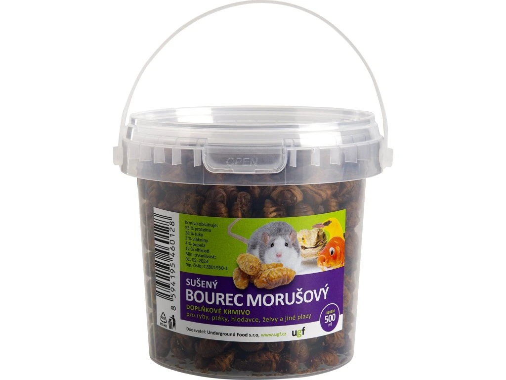 Bourec morušový, přesněji řečeno jeho sušené larvy jsou vhodným doplňkovým krmivem pro ryby, ptáky, potkany, ježky a želvy. Tato pochoutka je 100% přírodním doplňkovým krmivem určeným pro kapry KOI, kterým dodají potřebnou energii, podpoří rovnoměrný růst a zbarvení. Je také vhodná pro obohacení jídelníčku ptáků, potkanů, ježků a želv. Skvělým pamlskem je v neposlední řadě pro psy, včetně těch s potravinovými alergiemi. Sušené larvy bource obsahují vysoký podíl proteinů (53 %), zdravé tuky (27 %) a vlákninu (3 %). Mají velmi dobré složení aminokyselin a obsahují nadprůměrné množství vitaminu B1, B2 a B5. Díky výrazné chuti a vůni, jsou velmi oblíbení. Krmit lze několikrát denně v menším množství.