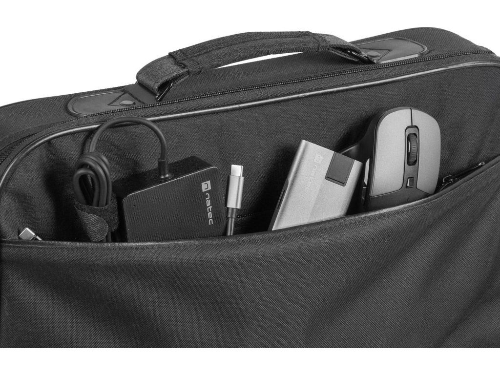 Brašna byla navržena tak, aby se do ní snadno vešel nejen notebook s maximální úhlopříčkou 17,3", ale také napájecí adaptér a další příslušenství. Kromě mobilního počítače v ní můžete přenášet i další důležité věci - díky přední přihrádce na zip, kam můžete schovat například dokumenty.