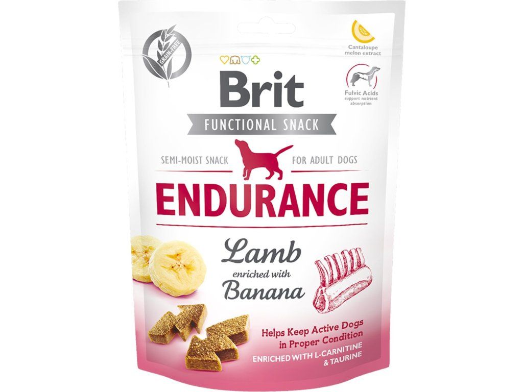 Dog Snack Endurance Lamb od Brit Care, to je jehněčí obohacené zdravím nabitými banány, které všichni psi milují. Dávejte je svému psovi denně za odměnu při výcviku nebo jako pamlsek během společných chvilek v průběhu dne. Zajistěte, aby měl váš pes vždy dostatek čerstvé pitné vody.