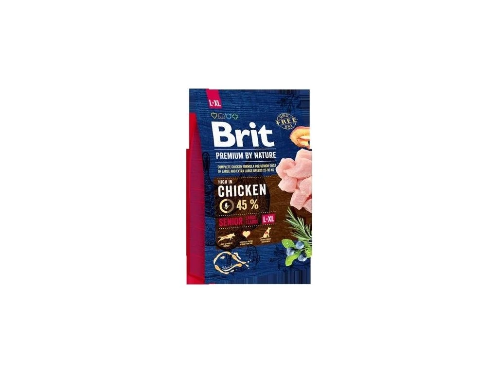 Brit Premium by Nature Senior je vysoce stravitelné a chutné krmivo s vysokým obsahem kuřecího masa 45 % a je určené starším psům 7 a více let velkých a extra velkých plemen s hmotností od 25 do 90 kilogramů. Vysoký podíl vykostěného a sušeného kuřete v každém balení zajišťuje vyšší chutnost a lepší stravitelnost krmiva. Maso je pro psy nejlepším přírodním zdrojem vysoce stravitelné bílkoviny, která je důležitá pro zdraví svalů a tkání. Krmivo má díky bílkovině lepší chuť a stravitelnost. Přídavky kolagenu, slávky zelenoústé a schránek korýšů podporují klouby a chrupavky vašeho psa. Přírodní zdroje chondroprotektiv jsou ideální pro zdravé klouby, chrupavky a šlachy. Lososový olej je přírodním zdrojem omega-3 mastných kyselin a dobře působí na zdravou kůži, lesklou a hustou srst, a také preventivně působí proti kardiovaskulárním nemocem. Díky obsaženému ovoci a bylinkám, jako jsou heřmánek, hřebíček, citrusy, rozmarýn, kurkuma a sušené borůvky, je zajištěna přírodní podpora imunity a skvělé trávení.
