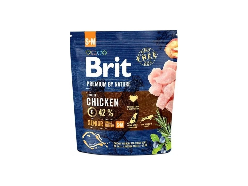 Brit Premium by Nature Senior small a medium je vysoce stravitelné a chutné krmivo s vysokým obsahem kuřecího masa 42 % a je určené starším psům 7 a více let malých a středních plemen s hmotností od 1 do 25 kilogramů. Vysoký podíl vykostěného a sušeného kuřete v každém balení zajišťuje vyšší chutnost a lepší stravitelnost krmiva. Maso je pro psy nejlepším přírodním zdrojem vysoce stravitelné bílkoviny, která je důležitá pro zdraví svalů a tkání. Krmivo má díky bílkovině lepší chuť a stravitelnost. Přídavky kolagenu, slávky zelenoústé a schránek korýšů podporují klouby a chrupavky vašeho psa. Přírodní zdroje chondroprotektiv jsou ideální pro zdravé klouby, chrupavky a šlachy. Lososový olej je přírodním zdrojem omega-3 mastných kyselin a dobře působí na zdravou kůži, lesklou a hustou srst, a také preventivně působí proti kardiovaskulárním nemocem. Díky obsaženému ovoci a bylinkám, jako jsou heřmánek, hřebíček, citrusy, rozmarýn, kurkuma a sušené borůvky, je zajištěna přírodní podpora imunity a skvělé trávení.