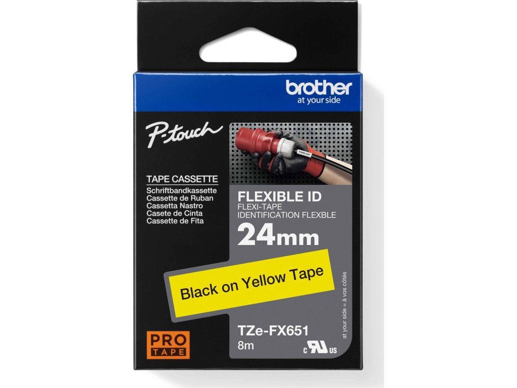 Kazeta s 24 mm páskou Brother TZe-FX651 s černým tiskem na žlutém podkladu byla navržena pro použití k identifikaci drátových a optických kabelů. Speciální lepidlo podkladové vrstvy umožňuje vícenásobné obalení štítku kolem kabelu nebo přilepení k němu ve stylu praporku.
