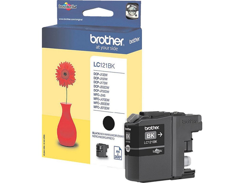 LC121Bk je černá tisková kazeta pro inkoustové tiskárny Brother s označením DCP-J132W/ DCP-J152W/ DCP-J172W/ DCP-J552DW/ DCP-J752DW/ MFC-J245/ MFC-J470DW/ MFC-J650DW/ MFC-J870DW. Pro tento inkoust se udává výtěžnost až 300 stránek při 5 % standardním pokrytí.