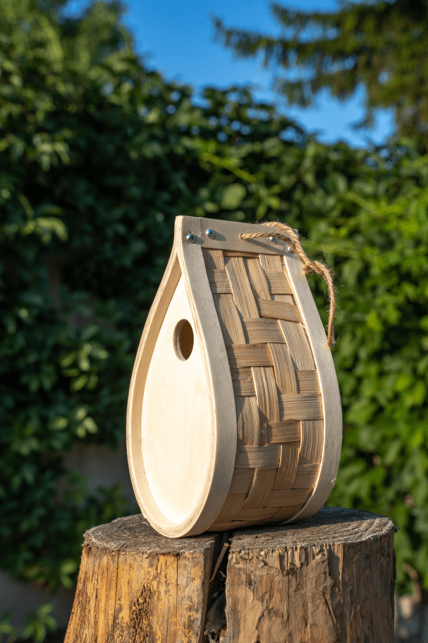 Venkovní dřevěná budka pro drobné ptactvo z překližky a bambusu