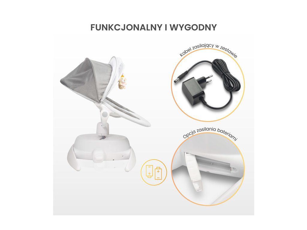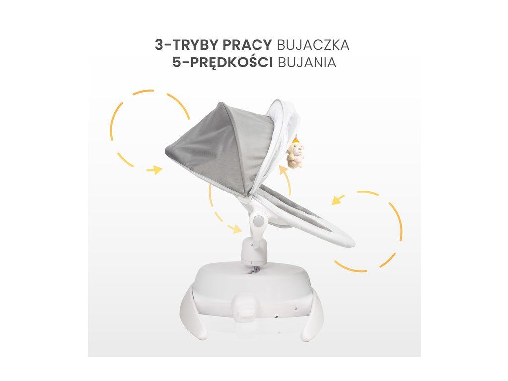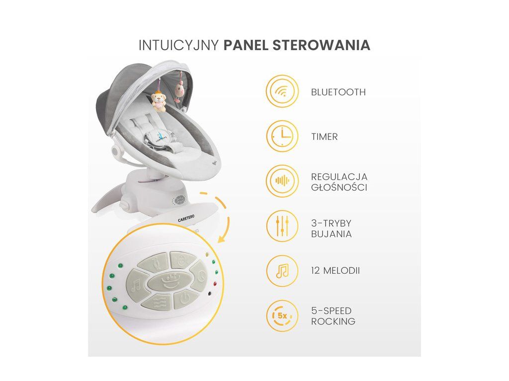 Intuicyjny Panel Sterowania5-stopniowa regulacja prędkości oraz wbudowany timer pozwalają na idealne dostosowanie urządzenia do potrzeb dziecka. Bujaczek oferuje 11 melodyjek oraz tryby z dźwiękami wody i śpiewu ptaków, wspierając relaksację i ułatwiając zasypianie. | ![]() |