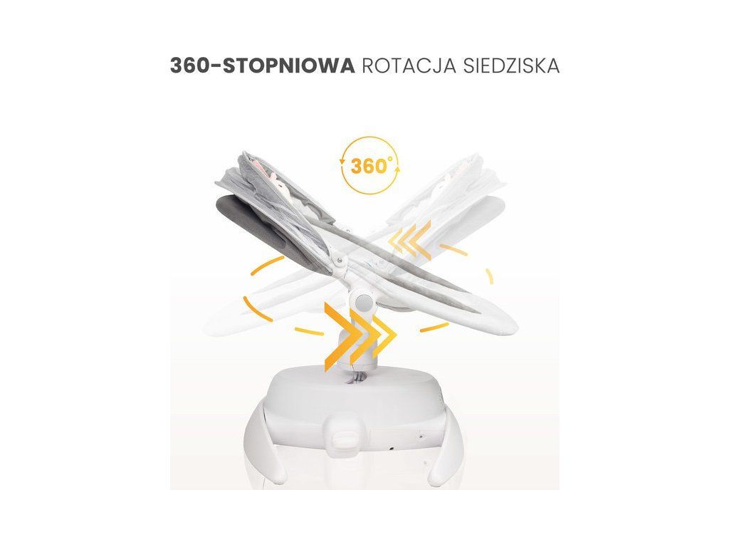 • 360-stopniowa rotacja siedziska - OPTI umożliwia pełne obroty siedziska o 360 stopni, dzięki czemu bujaczek nie musi być przesuwany aby rodzic mógł doglądać śpiącego dziecka podczas krzątania się po pokoju;