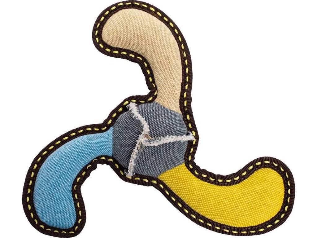 Bumerang 27 cm, robustní aport pro psy, tkaná látka, béžová/modrá/žlutá, HipHop Dog