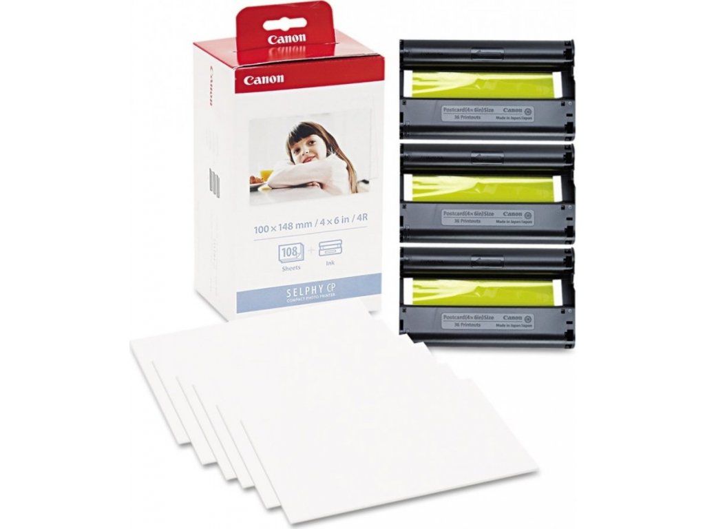 Canon KP-108INSada pro tisk fotografií ve formátu 10 × 15 cm na termosublimačních tiskárnách Canon. Balení obsahuje materiál na vytvoření 108 fotografií. Produkuje vysoce kvalitní voděodolné fotografie s garancí až 100 let bez blednutí. Technologie tepelné sublimace zaručuje nádherné barvy.
